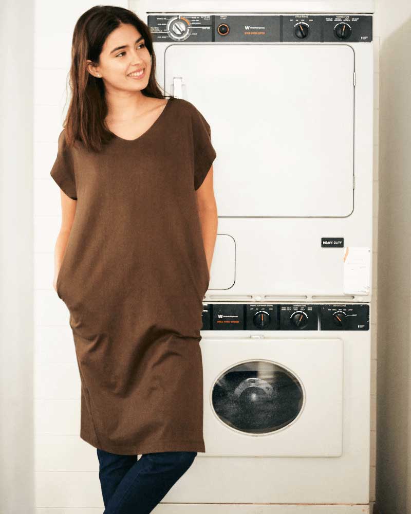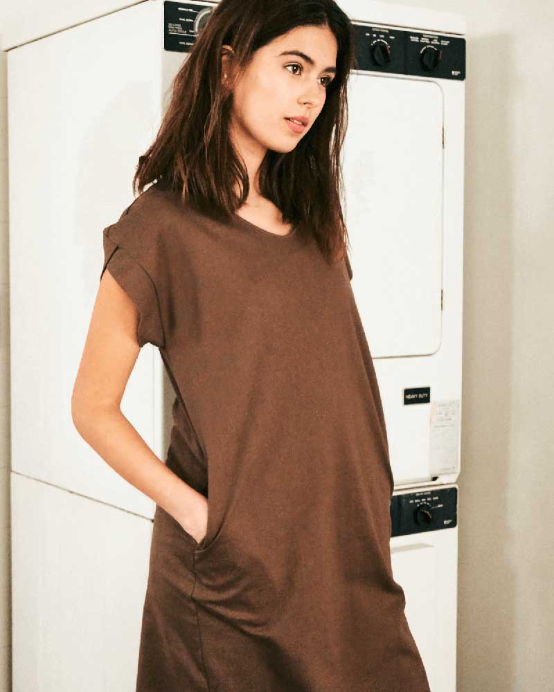 身体の線を拾わないカットソーワンピースは、シャリ感のあるオーガニックコットンを使用。ドライタッチで肌離れが良く、これからの季節にうってつけです。左の裾にだけスリットが入っているのがポイント。
