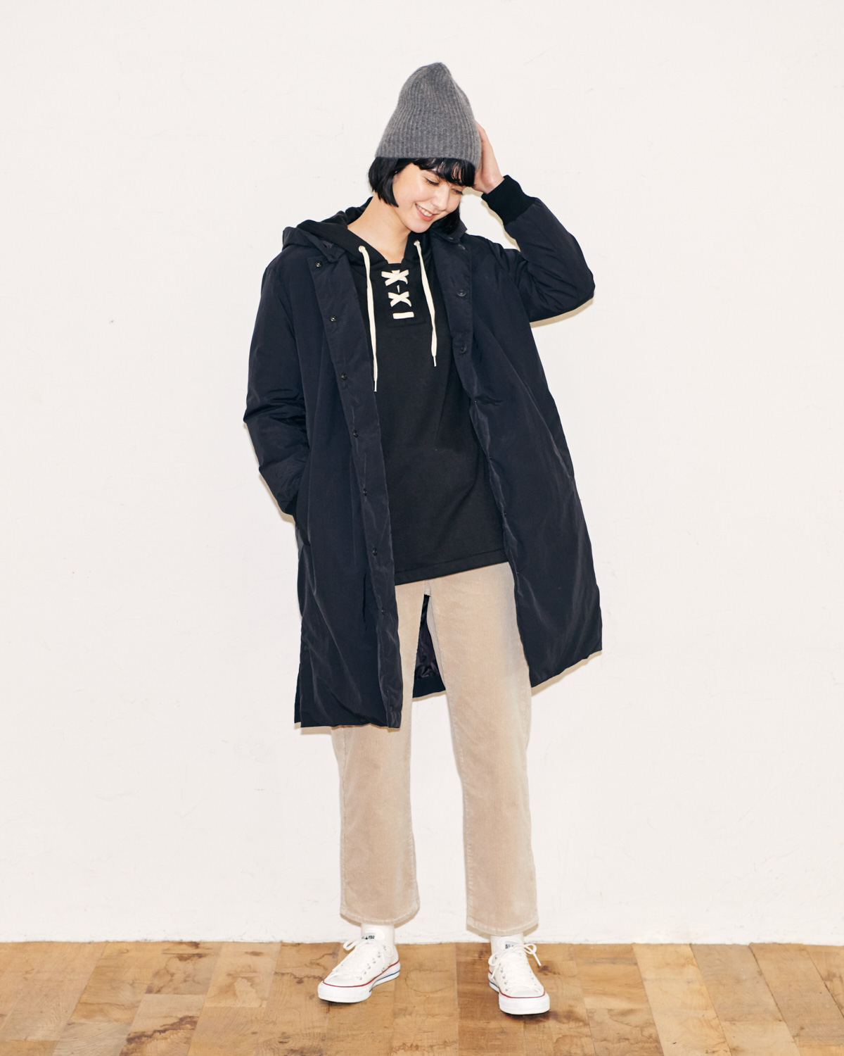 フードは取り外し可能で、抜け感のあるコーディネートもおすすめ。
