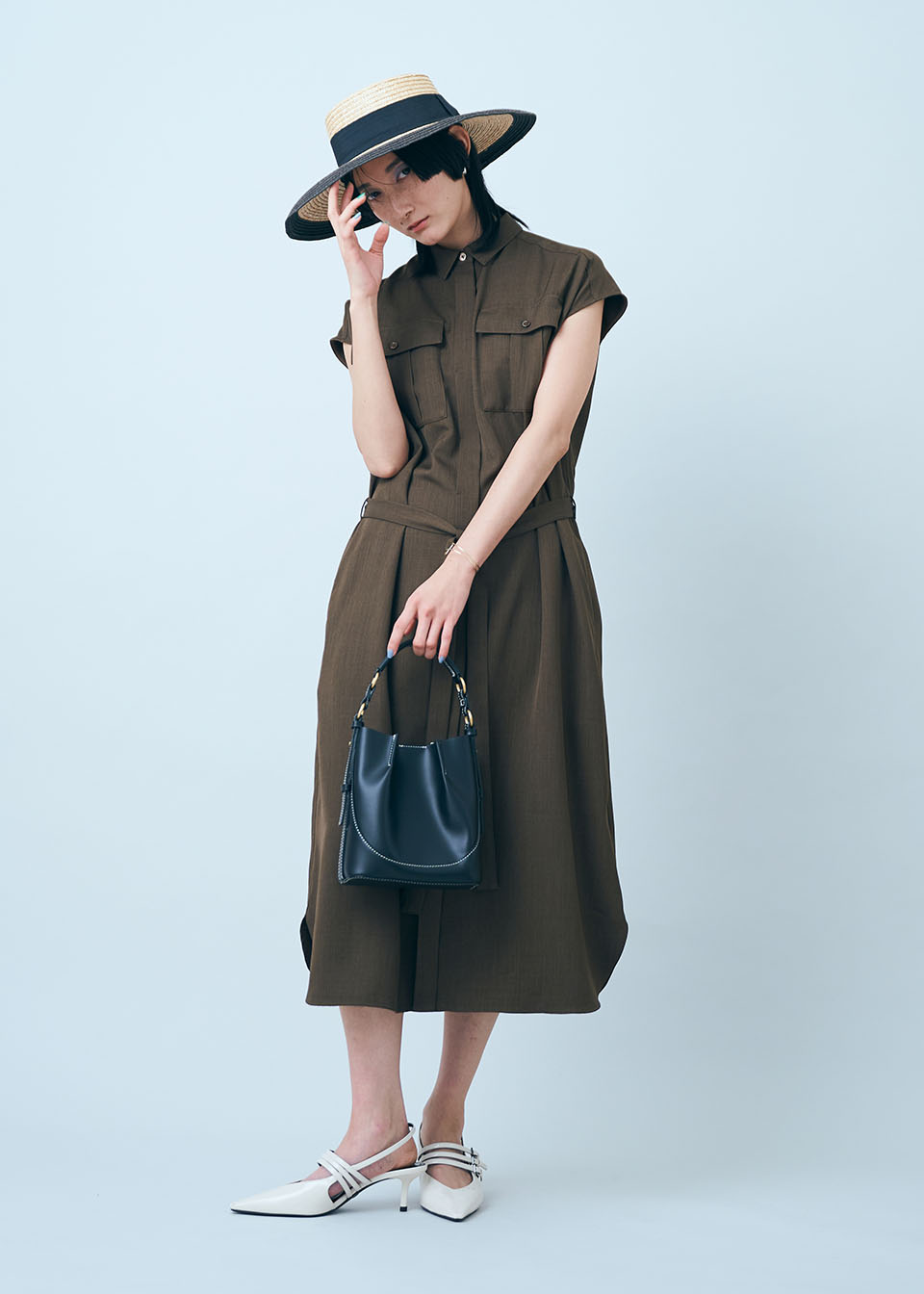 ヴィンテージ加工のミリタリーカラーシャツワンピースに、ボーターハットを合わせてガーリーさをプラス。涼しいポリエステル素材を使用し、手洗い可能で乾きが早く、イージーケアなのも嬉しいポイント。