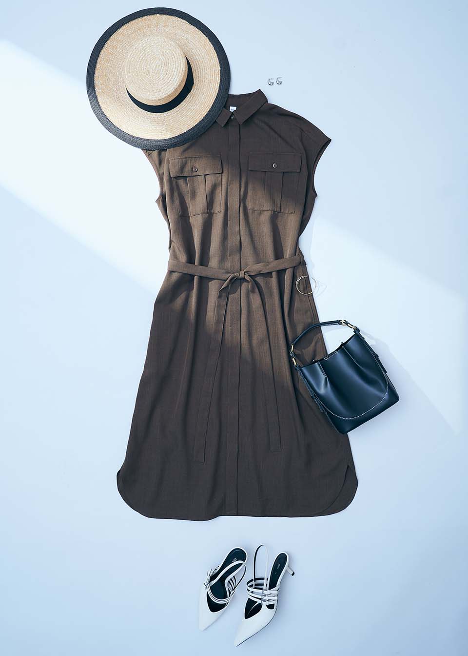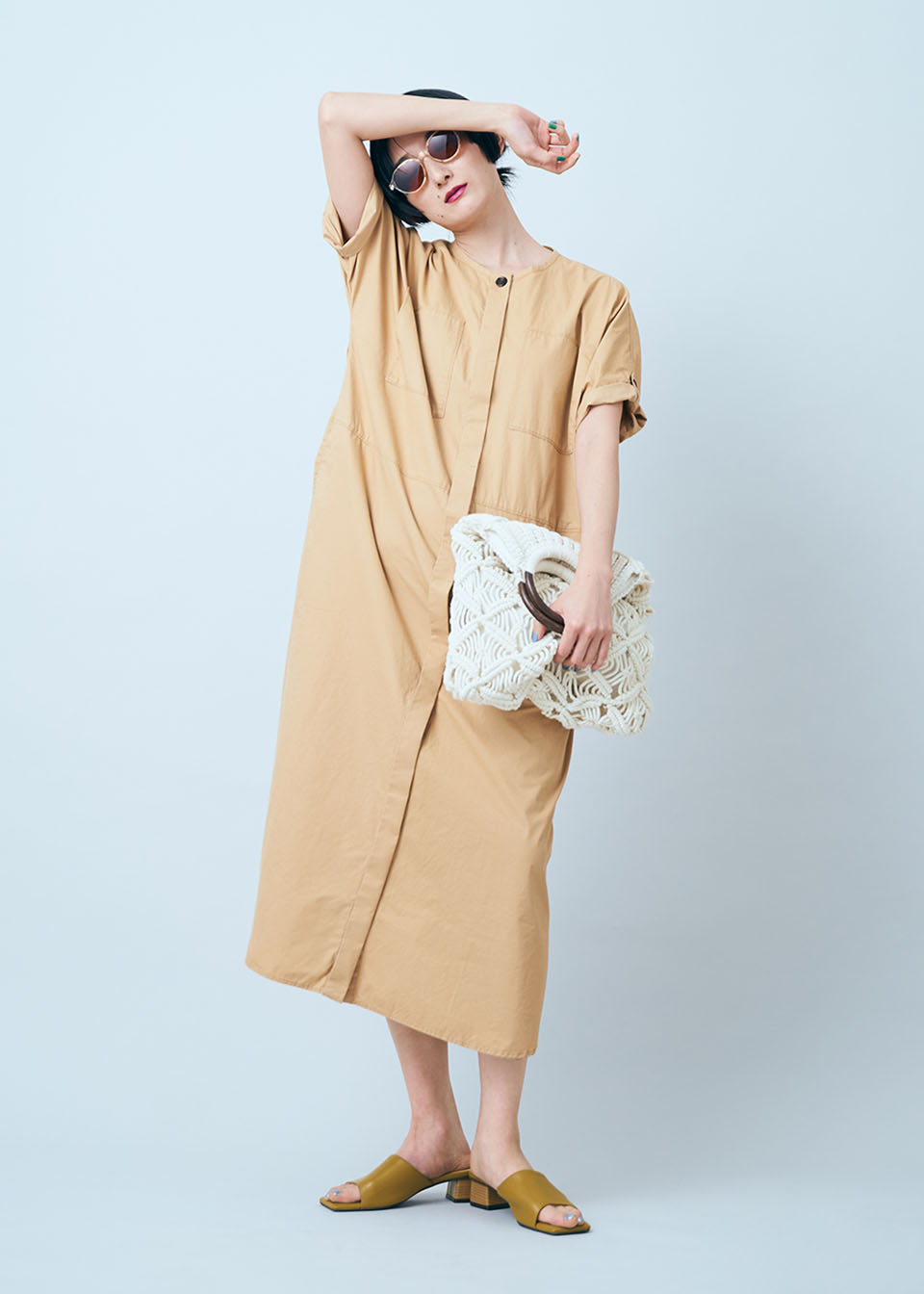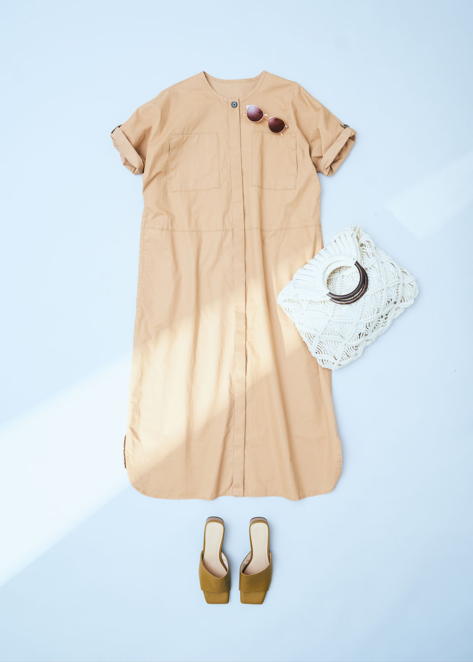 ベージュカラーに、相性の良いイエロー、ホワイトの小物をプラスしたシャツワンピーススタイル。