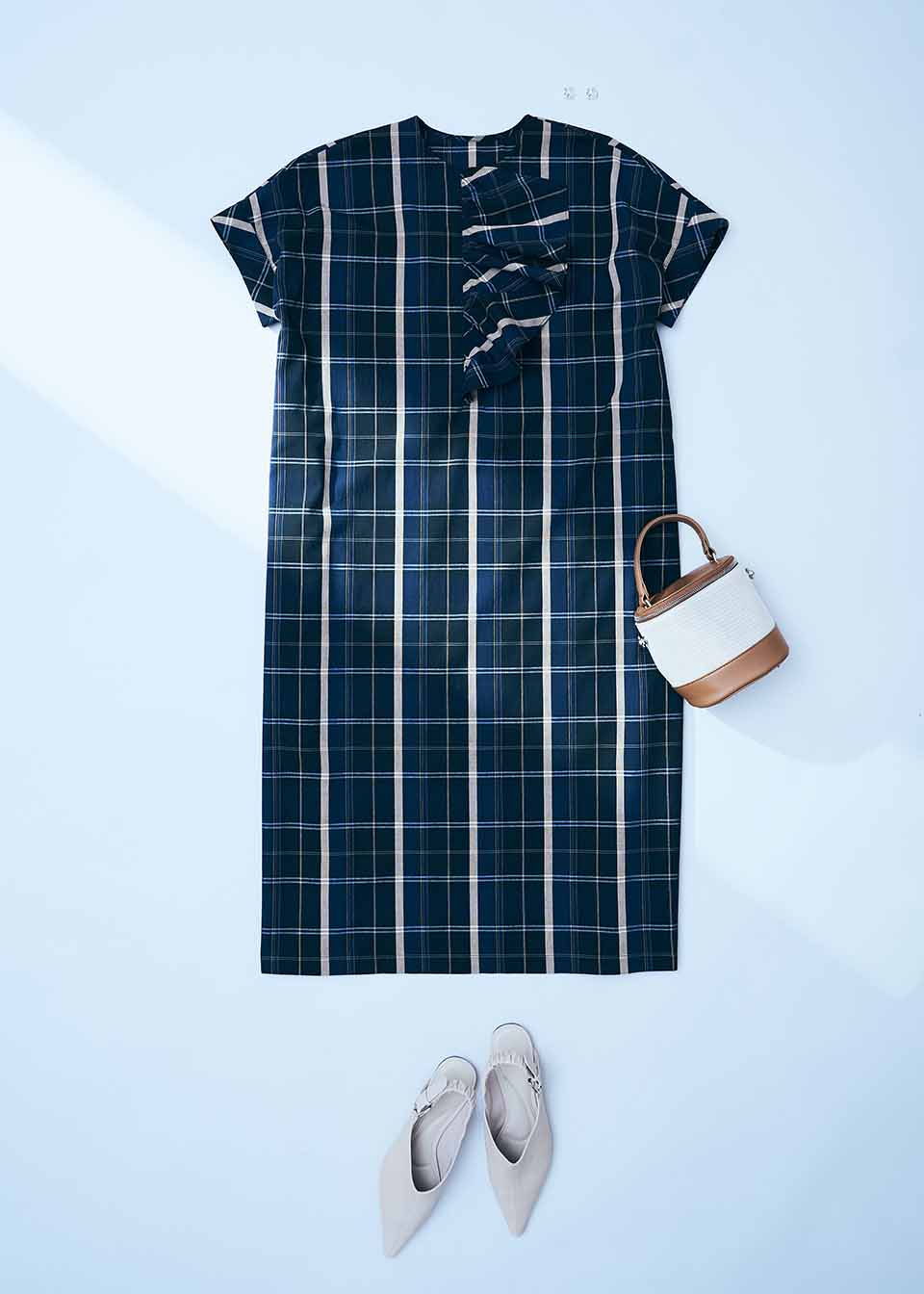 襟元のフリルがポイントの大きめチェックのコットンワンピース 。チェックの配色に合わせてミニバッグとスリングバックシューズをプラスすればまとまり感が出て◎