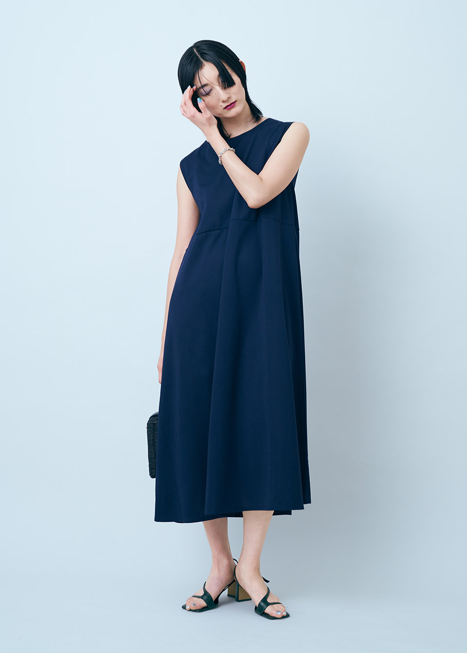 ネイビーのノースリーブワンピースにブラックの小物を合わせて、とことんシックに。重くなりすぎないようにカゴバッグをチョイスして、落ち着いた雰囲気の中にも軽やかさをプラス。