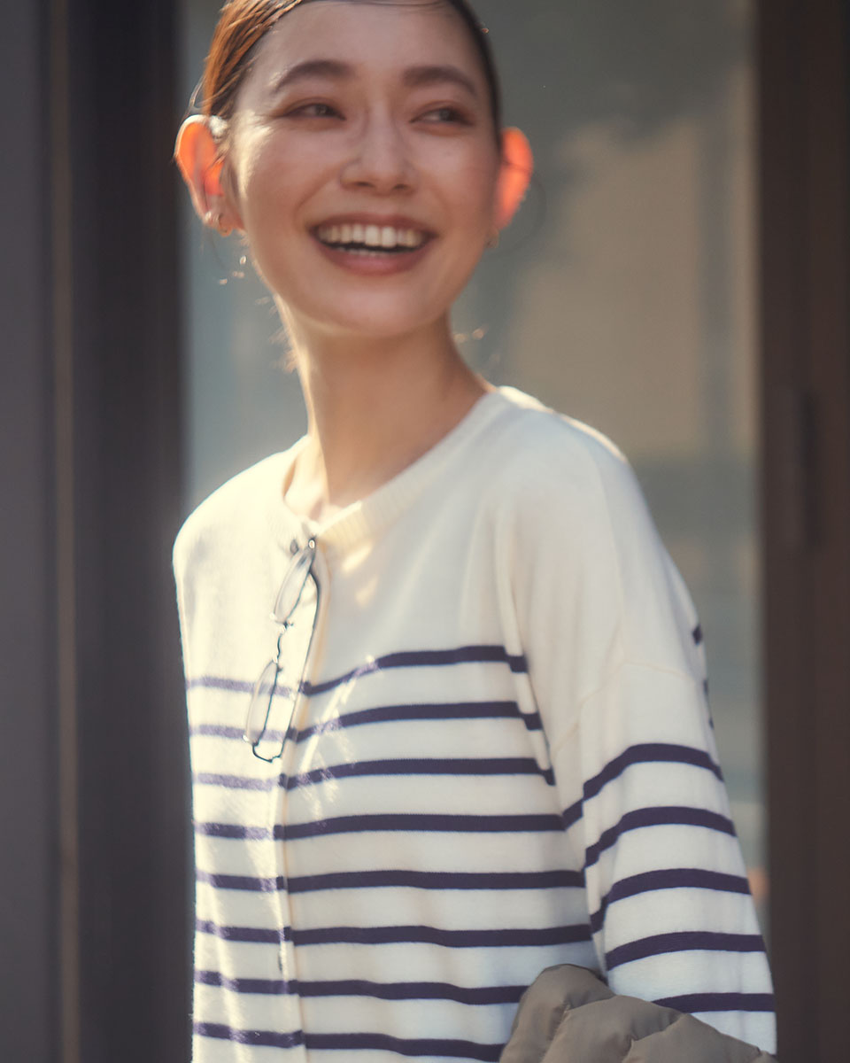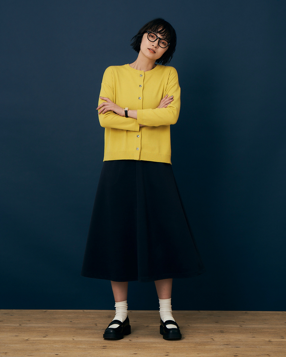 シンプルなニットカーデは、気温調節がむずかしいこの時期、使える幅が抜群に広い実用アイテム。