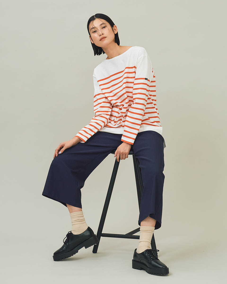 セントジェームス、オーシバルに並び、世界三大バスクシャツの一つとされるルミノアのバスクシャツをワードローブにくわえてみてはいかがでしょうか。