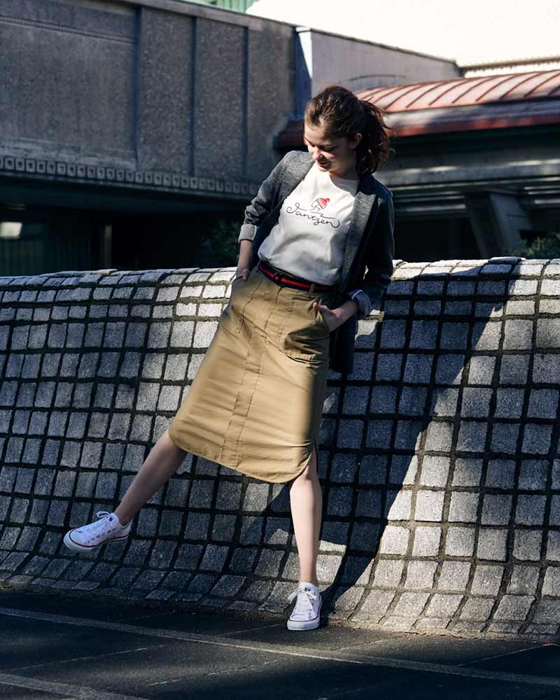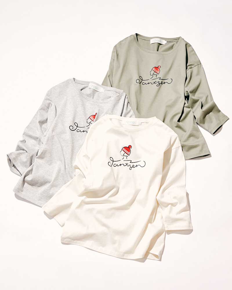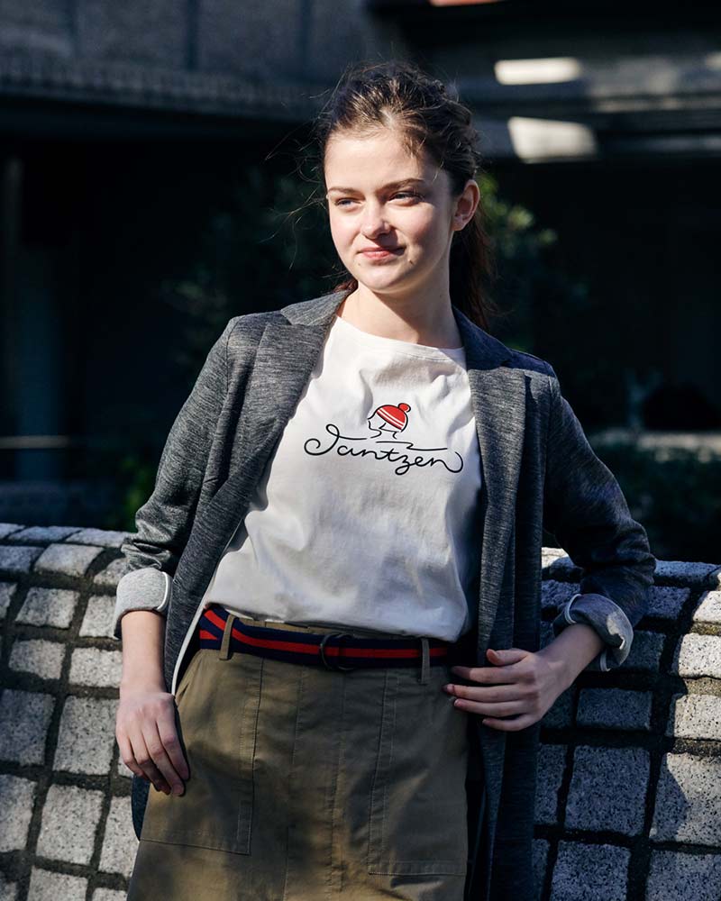 今回選んだオーガニックコットンは超長綿であることもポイント。とても柔らかく、表面がなめらかで、肌あたりが心地いいのが特徴です。フロントにはジャンセンガールの横顔をプリント。ジャケットやカーディガンなど、春先のアウターとの合わせにもおすすめです。