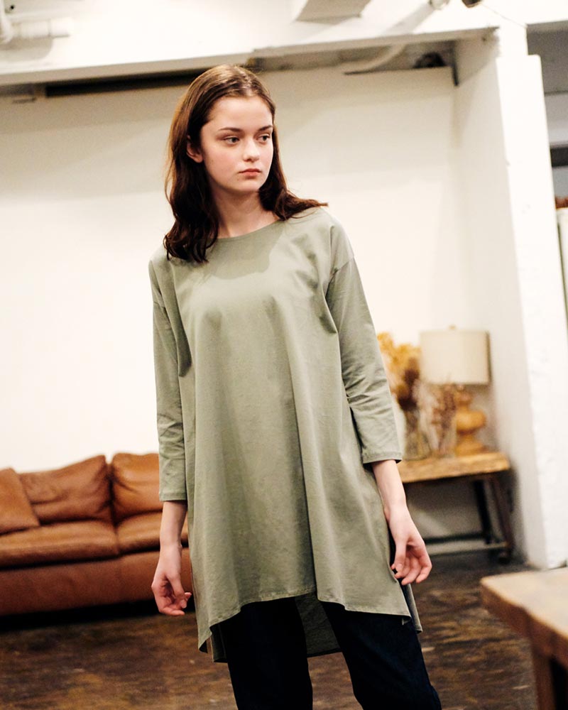 同じくオーガニックコットンの超長綿を使用。肌ざわりがなめらかで柔らか。着心地が快適です。ゆとりのあるネック周りと7分丈の袖は、Tシャツと同じですが、こちらはゆったりとしたチュニックタイプ。裾に向かって少し広がるシルエットで仕上げました。