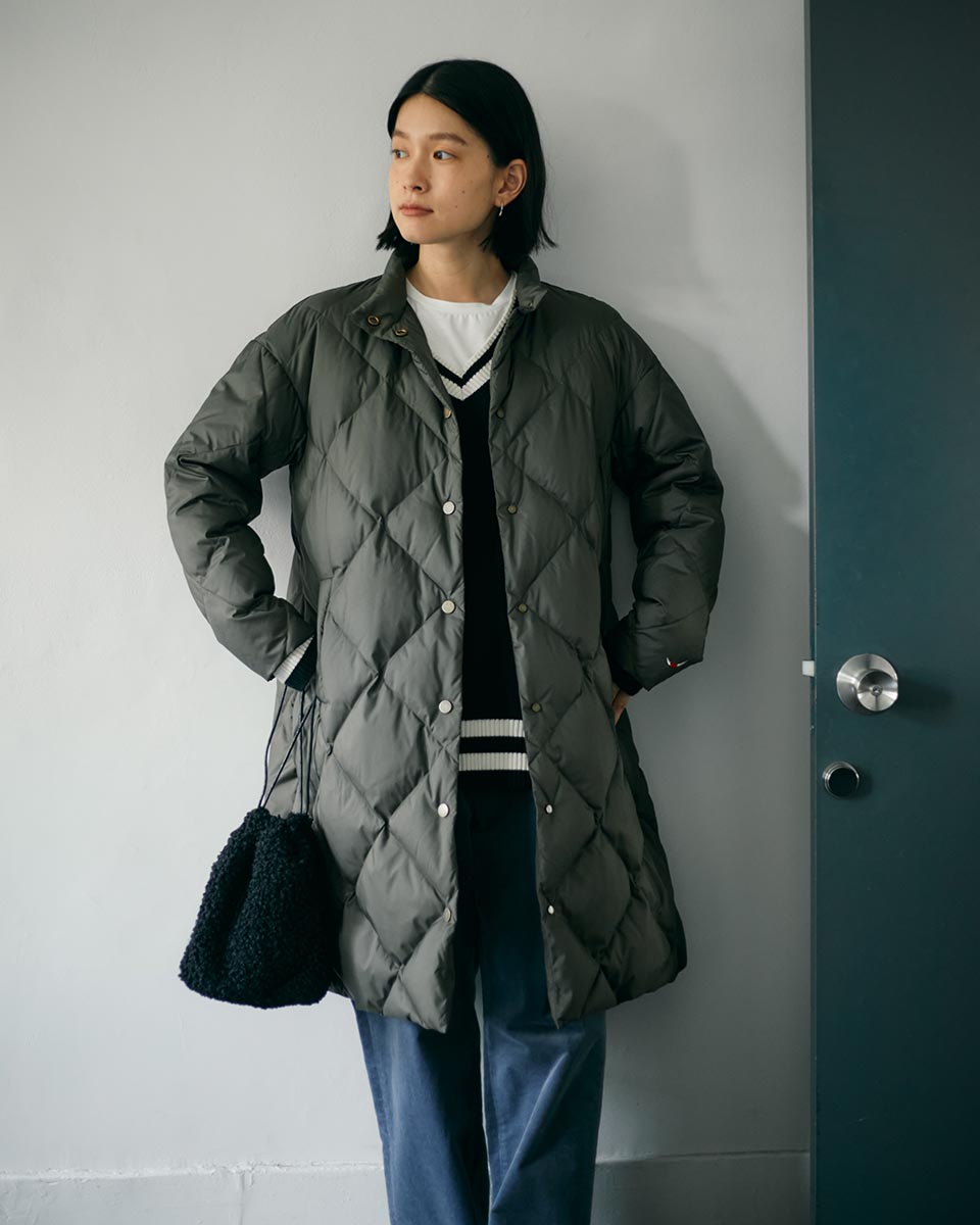 ジャンセンのダウンはFP(フィルパワー)700以上リサイクルダウンを使用。大きめのスクエアキルトコートは、ほどよいレングスでボトムスを選ばない便利なサイジング。
