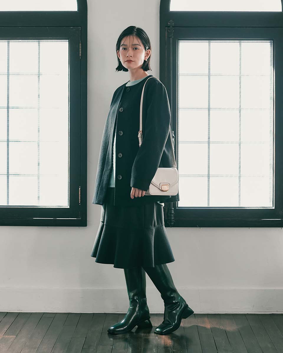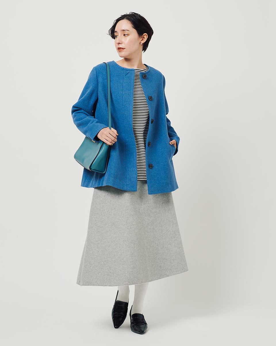 毎年人気の尾州ウールを使用したショートコート。2色の糸を使って織った素材は深みのある色目で雰囲気のある仕上がりに。軽量なのも嬉しいポイント。