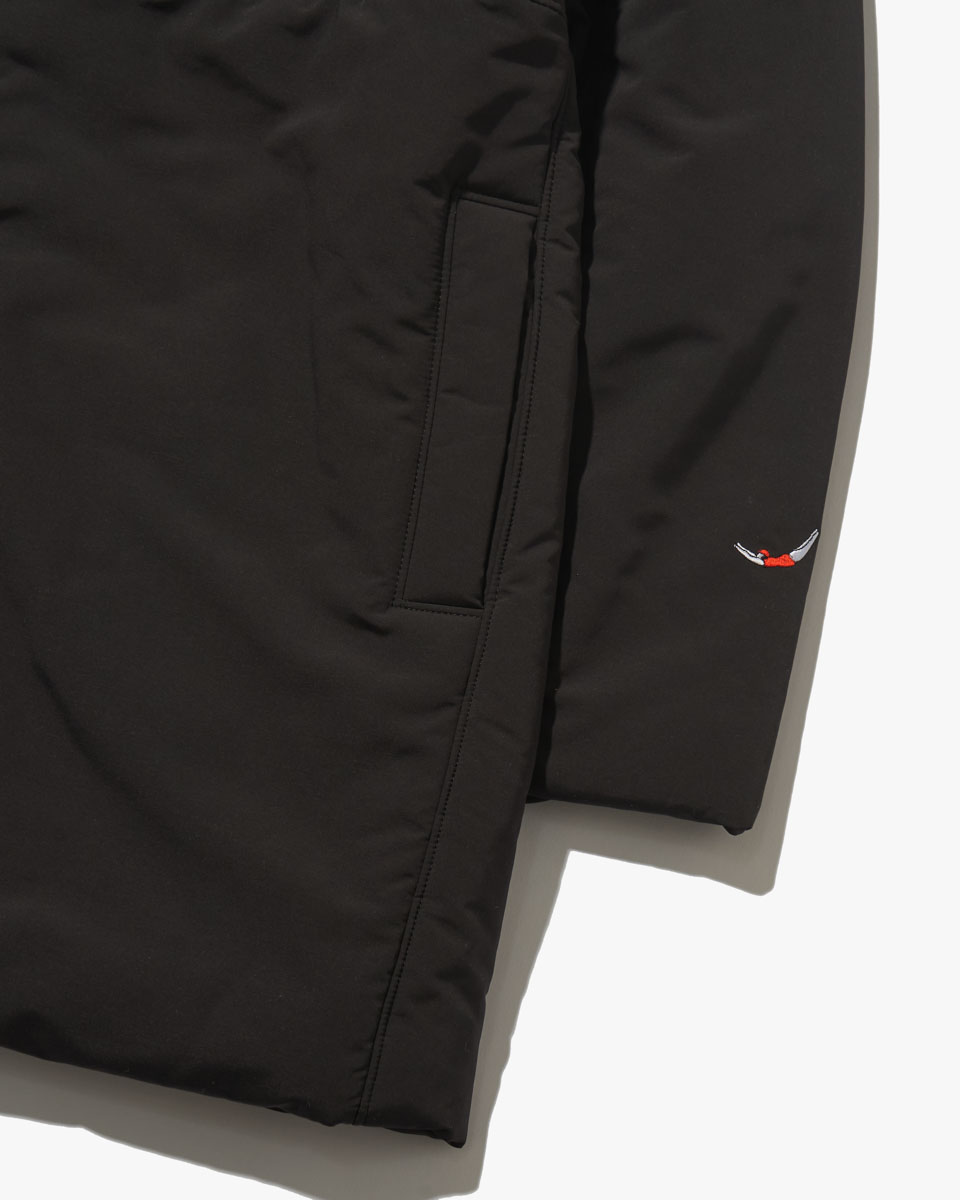 軽く保温性の高い機能性中綿使用のフードジャケット。 キャメルはブラックの配色ライン入りで、コーディネートの主役になるアイテム。