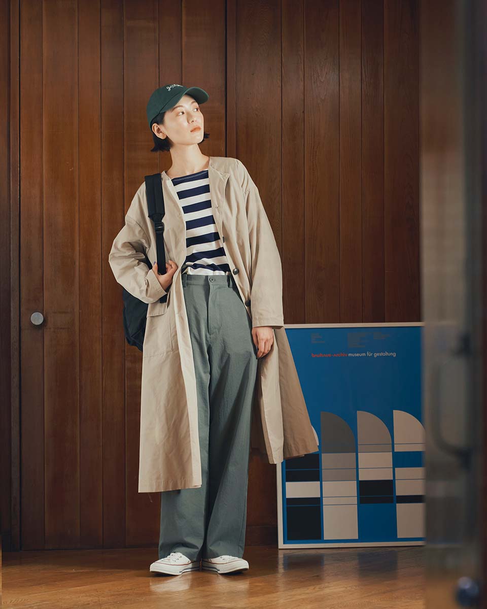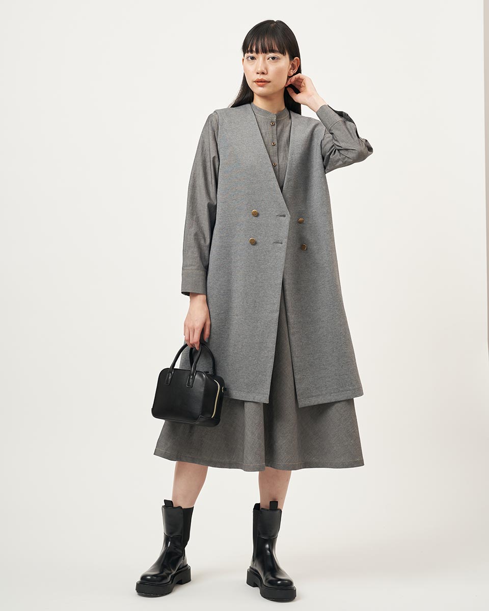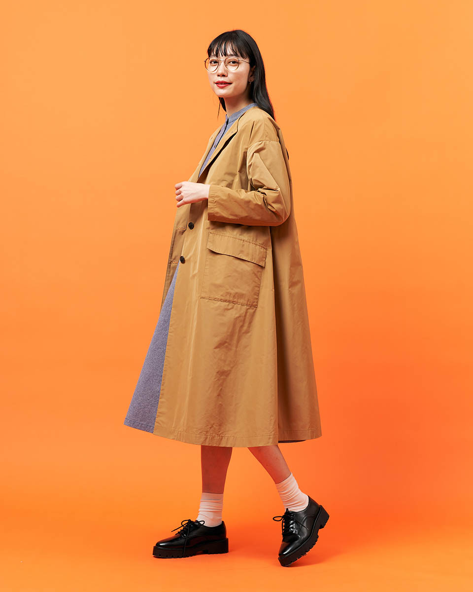 ゆったりしたシルエットのノーカラーコートは、さらっと羽織れて使い勝手の良いアイテム。上品なツヤ感とテントラインのシルエットが女性らしさを引き立ててくれます。形状記憶素材で、しわがすぐ伸ばせるのも嬉しいポイント。普段使いだけでなく、春の旅行などにも最適です。