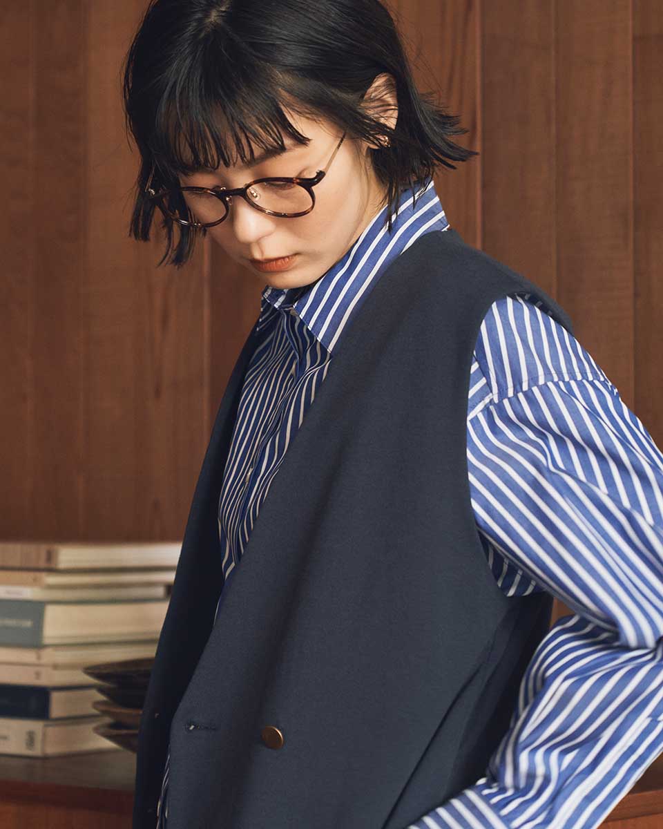 おすすめなスタイリングはロンドンストライプとのマニッシュな着こなし。程よいVネックの開きとWブレストでマニッシュなスタイルに合わせても、女性らしいニュアンスがほどよく薫ります。