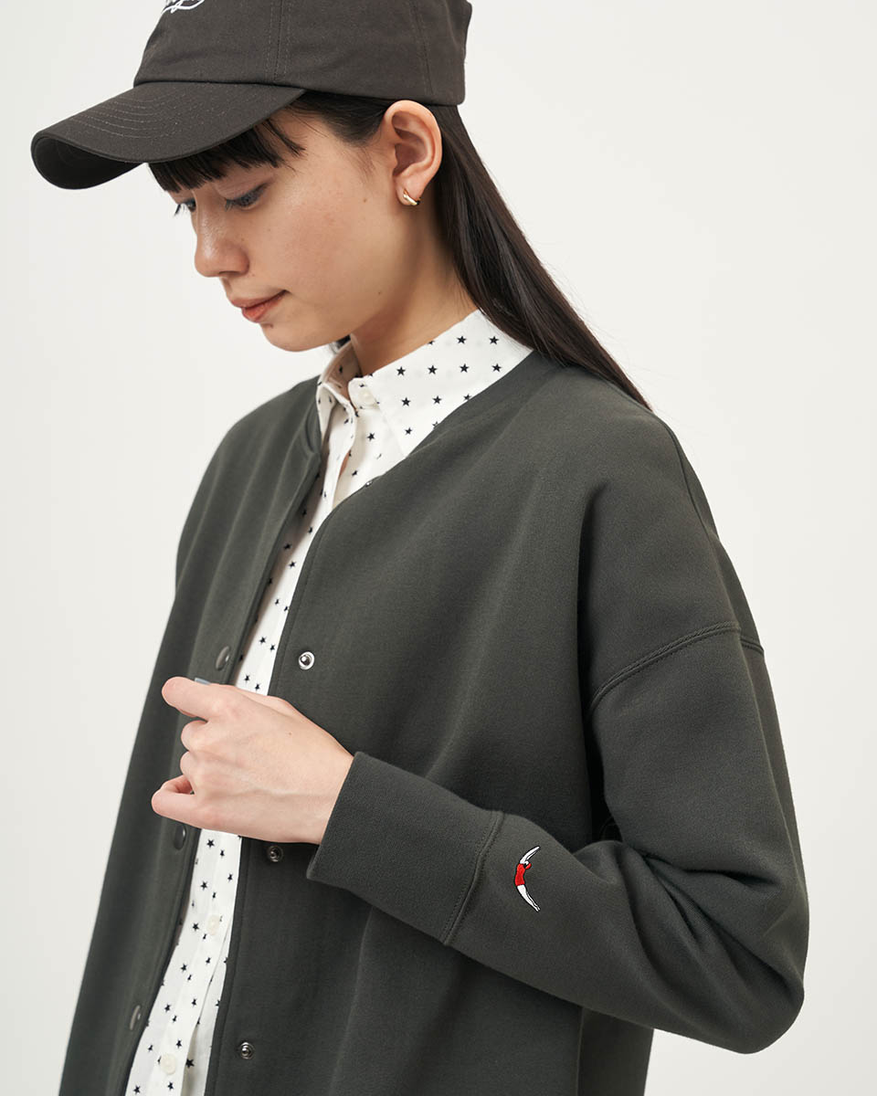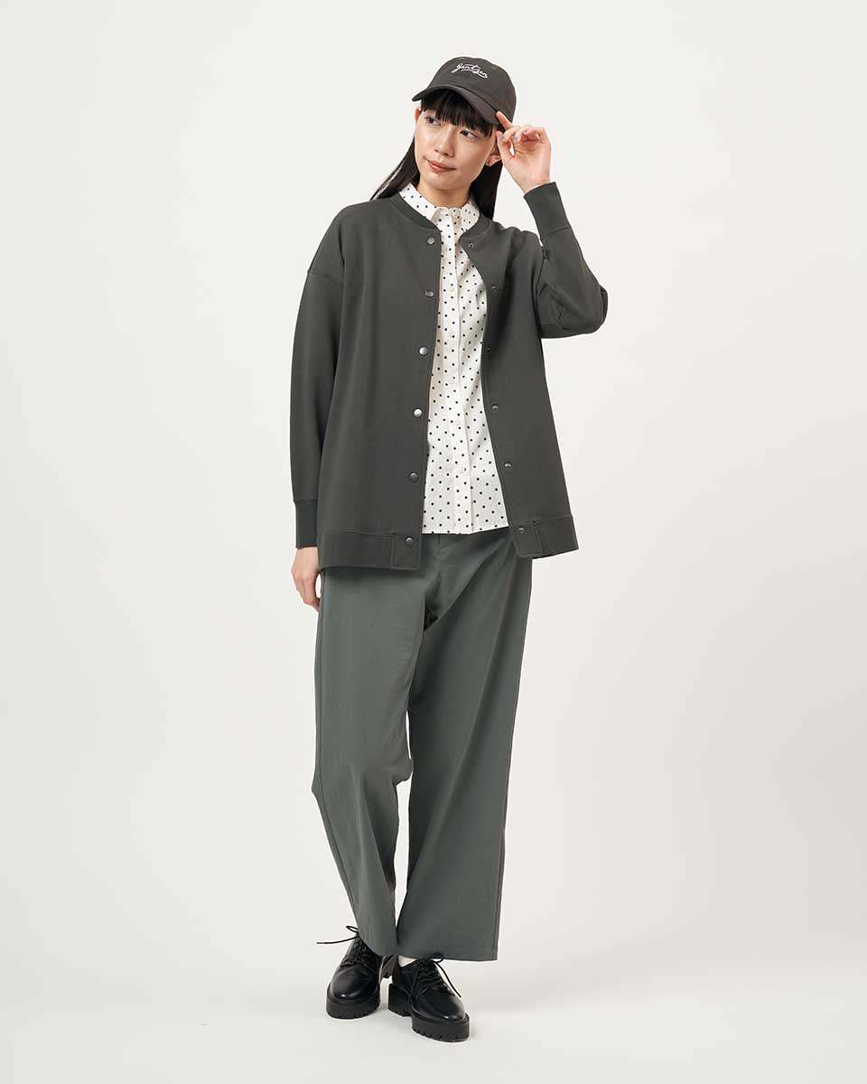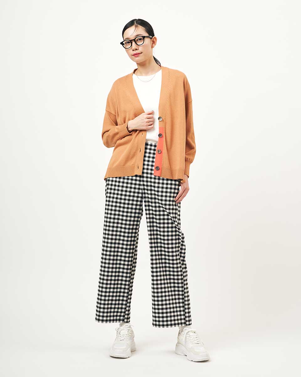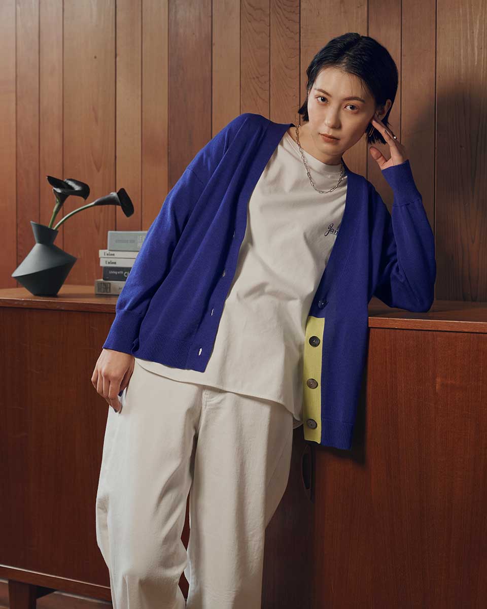 そんな気持ちに寄り添った、コットンピスコースのきれい目で柔らかい糸を使ったニットカーディガンは、大きめの貝調釦+前立てのアクセントカラーが効いているので、合わせるインナーはさらっと無地ベースのスタイリングがおすすめ。