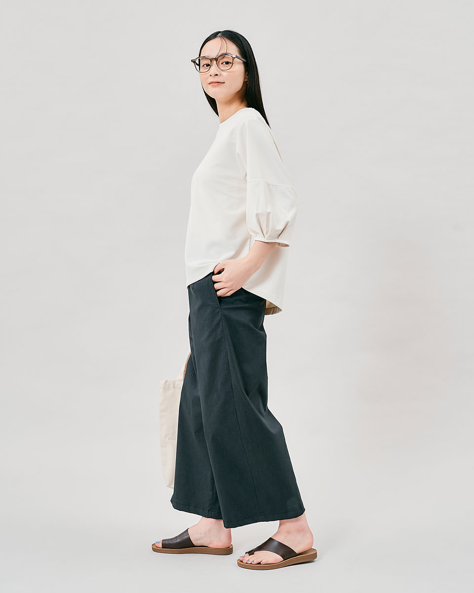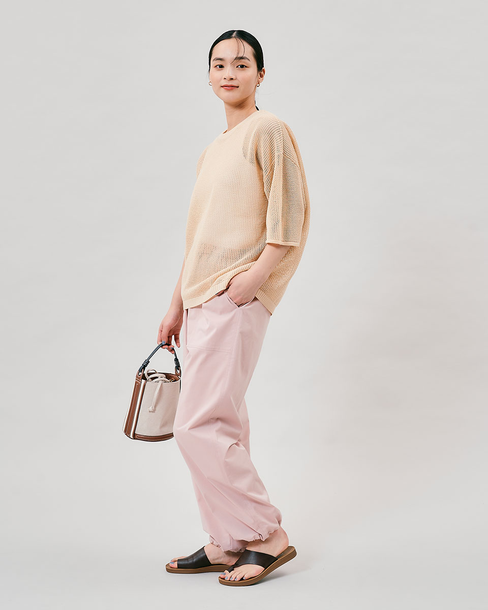 楽ちんな太めゴムウエストながら、きちんと感も演出。気になるお腹周りを優しくカバーし、すっきりとしたラインを実現します。適度なハリ感が、春夏の装いを美しく引き立てます。