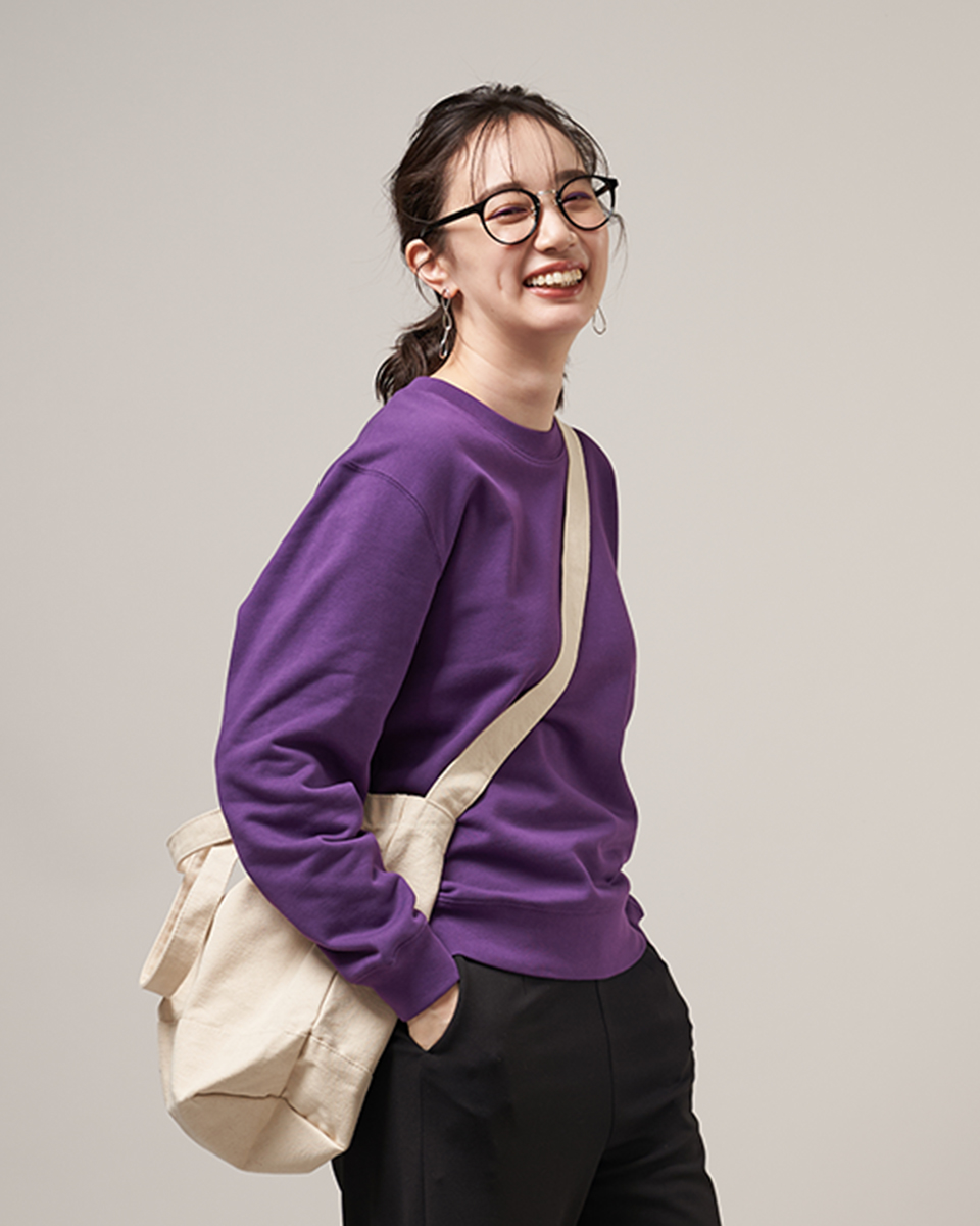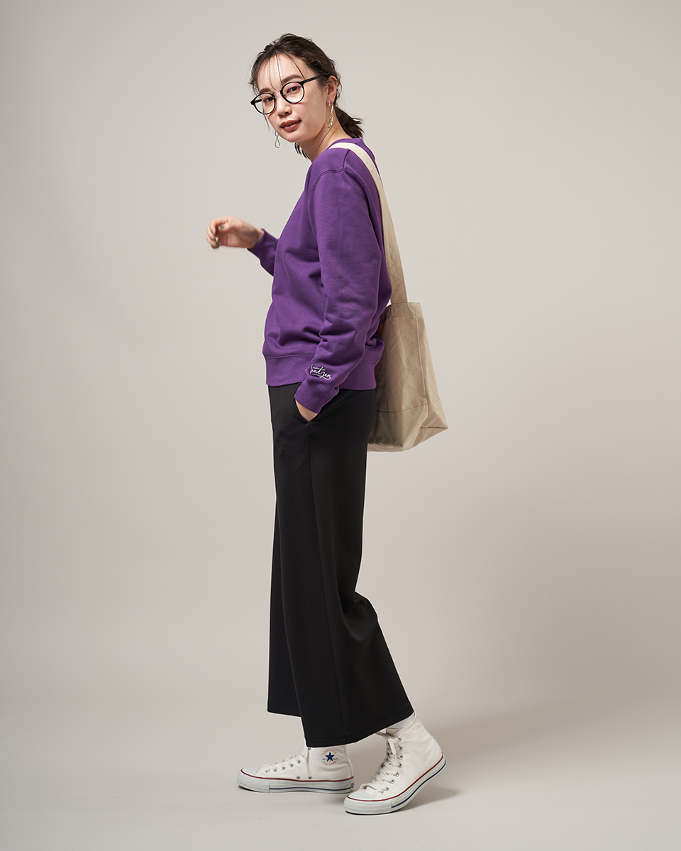 強気なパープルカラーは、シャープな黒のボトムと合わせてちょっとクールに。キャンバスのバッグとスニーカーを合わせることで、こなれ感もプラス。