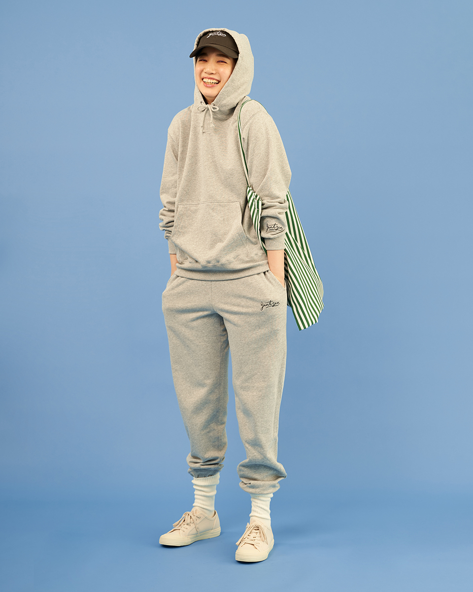 グレーのパーカ&パンツはセットアップでアクティブに。思いっきりカジュアルに振り切ったコーディネートは軽快でたくさん笑える一日になること間違いなしです。