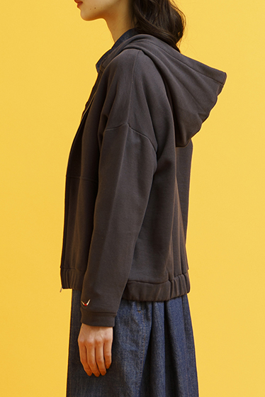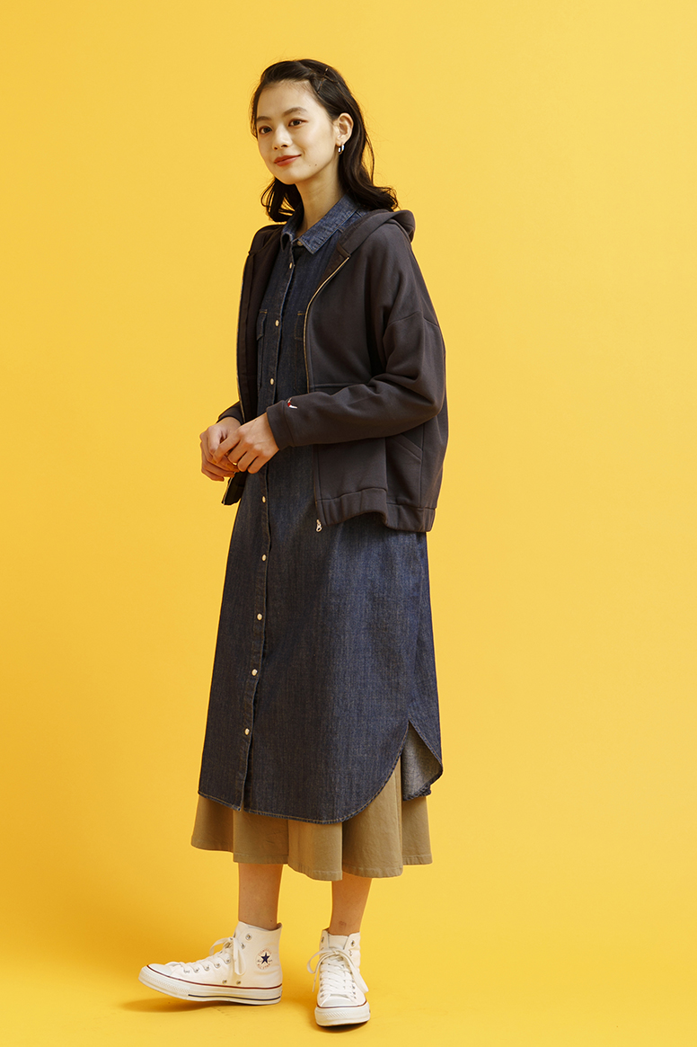 デニムワンピに羽織っているのは、プルオーバーと同じ素材のフルジップパーカー。適度に肉感はありつつも厚過ぎない為、さらっと着れる生地感です。ベーシックなシルエットながら、切り替えラインでさり気ないアクセントを効かせたアイテムに仕上がっています。