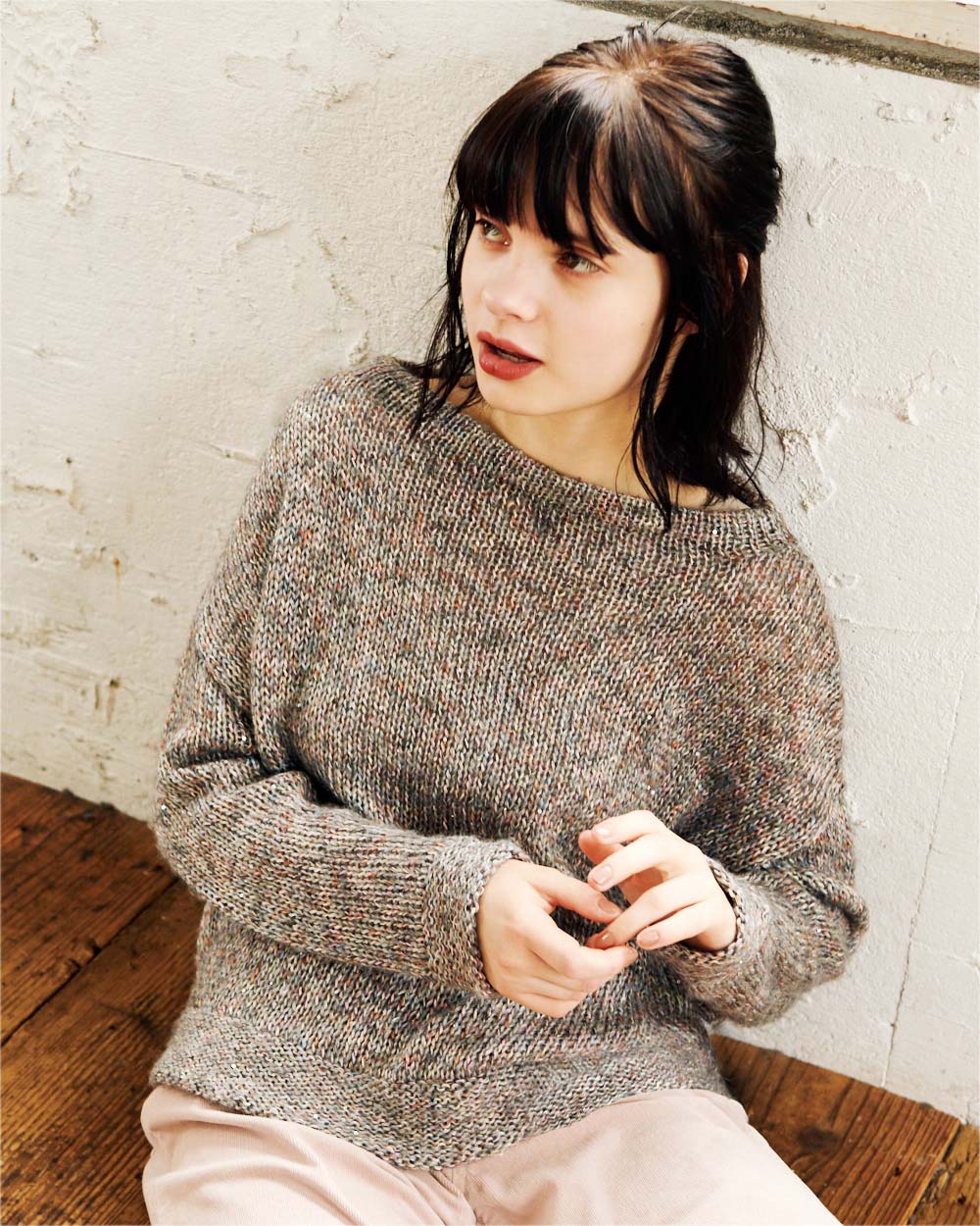 ミックスカラーであることに加えて、小さなスパンコールが撚糸されているのもアクセント。そのさり気ない光が、ニュアンスカラーに際立ちます。使い勝手がいいけれど、ありきたりじゃない。そんなバランスを追及しました。