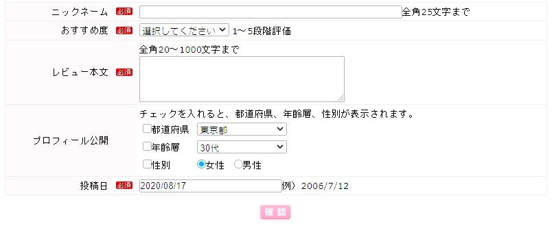 投稿フォームに必須事項を入力し、「確認」 のボタンを押します。