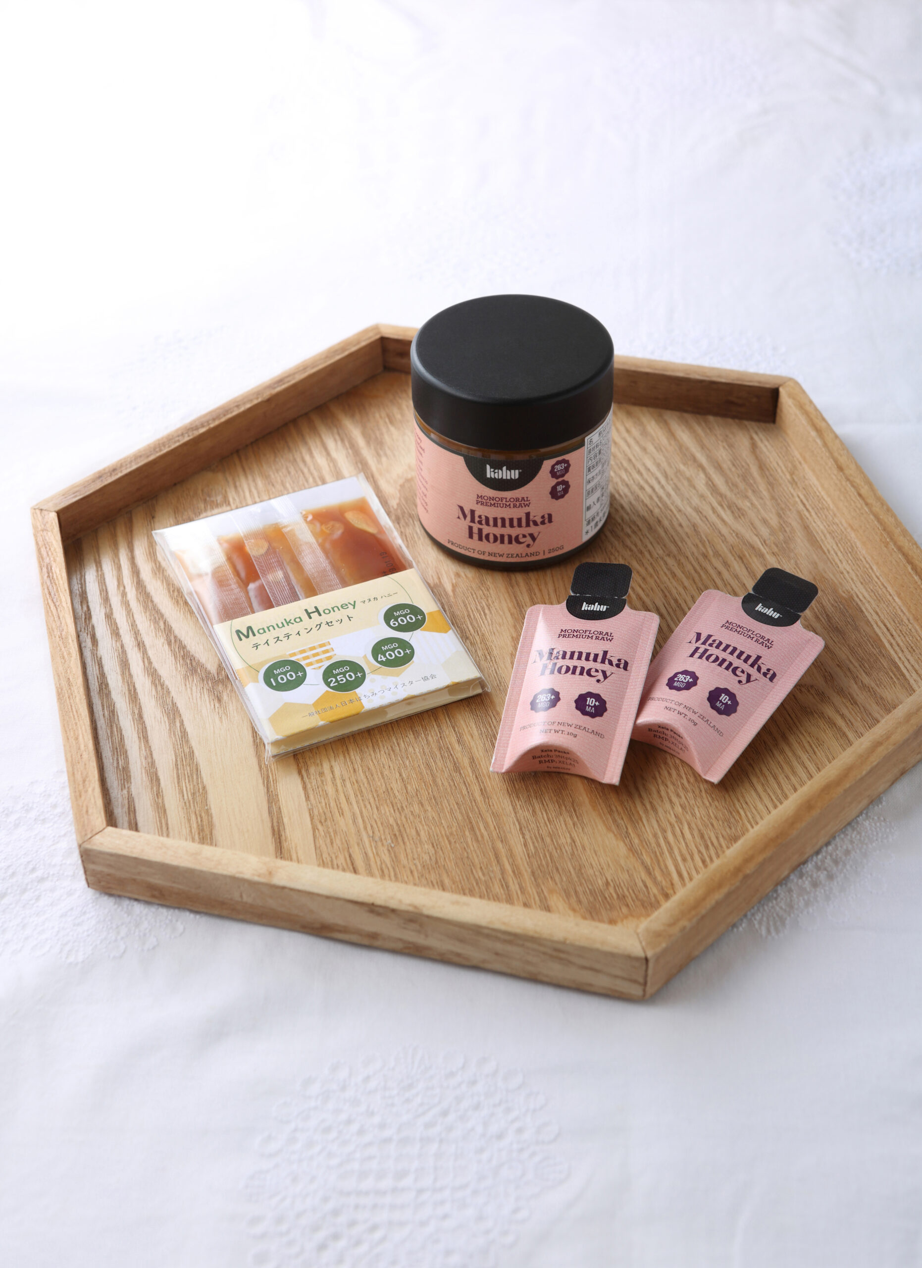 左:ニュージーランド産マヌカハニー数値違いの食べ比べ4種セット(一般社団法人 日本はちみつマイスター協会) 中央・右:ともにニュージーランド産マヌカハニーMGO263+(株式会社kahu Japan)