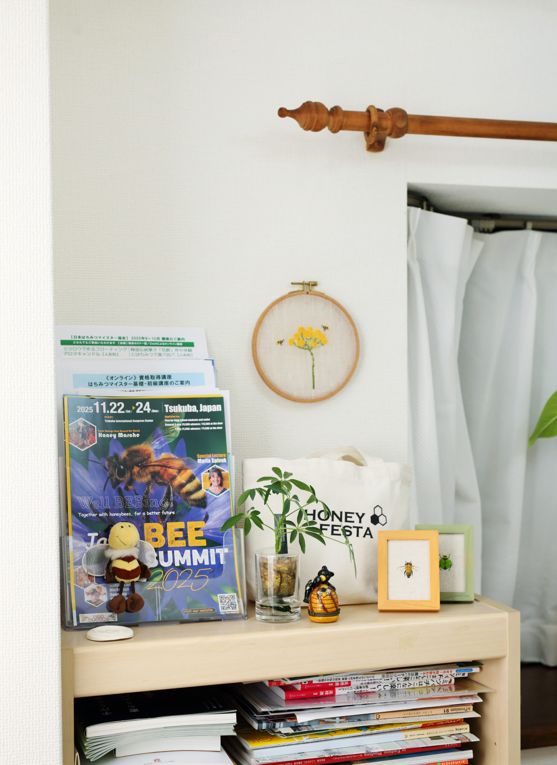 みつばちモチーフのグッズに目がなく、人からいただくことも多いという河村さん。本棚にははちみつやみつばちに関する本がぎっしり詰まっていたり、壁や棚にみつばちの刺しゅう作品が飾ってあったり、随所に河村さんのはちみつへの思いが感じられます。