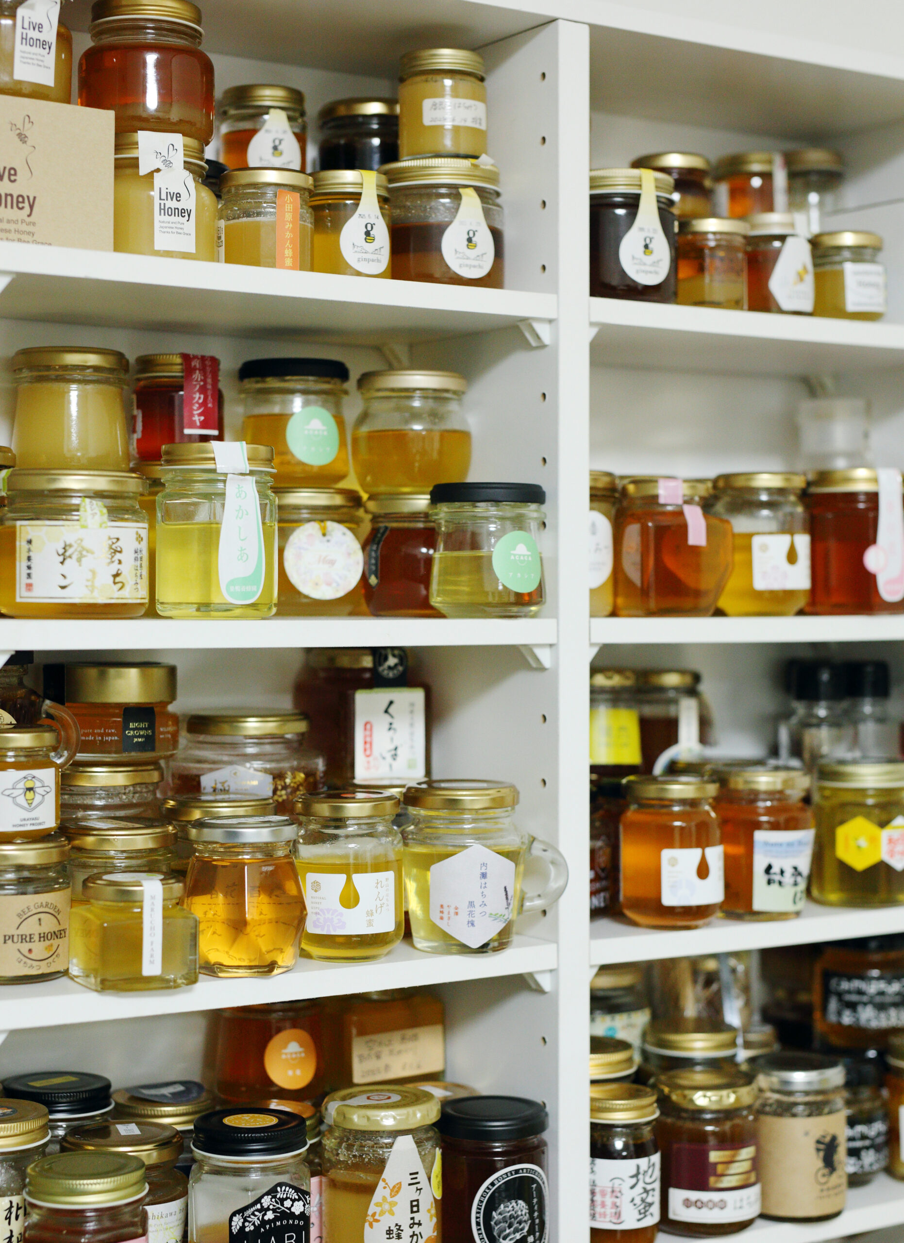 お教室でひときわ存在感を放つはちみつ棚には、国内外から集められた150種類以上のはちみつがずらり。「一口にはちみつといってもそれぞれ色も味も違って、ミネラルが豊富なはちみつは色が濃く、濃くなるにつれて、香りが濃厚で味のクセも感じやすくなります」とのこと。色の違いを知ることで、はちみつ選びの参考になりますね。
