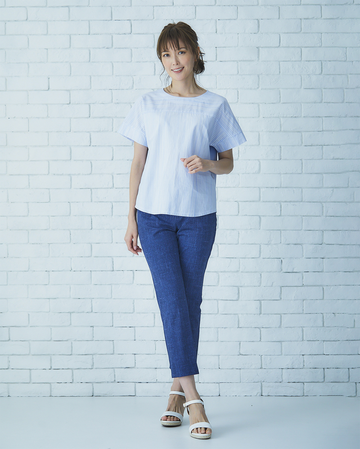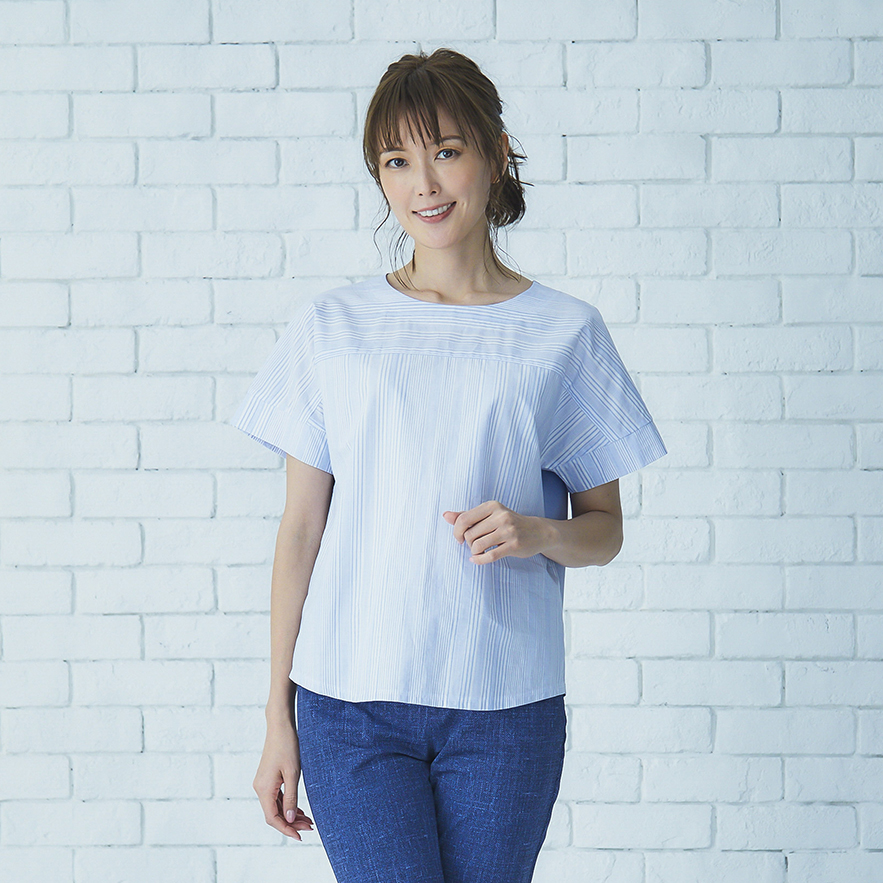 ストライプ生地にドルマンスリーブデザインが爽やかでフェミニンなルックスのカットソー。 フロントの布帛部分はボーダーとストライプを切り替えがアクセントになっています。 後身頃と袖口にジャージ素材を使用することで快適な着心地に。