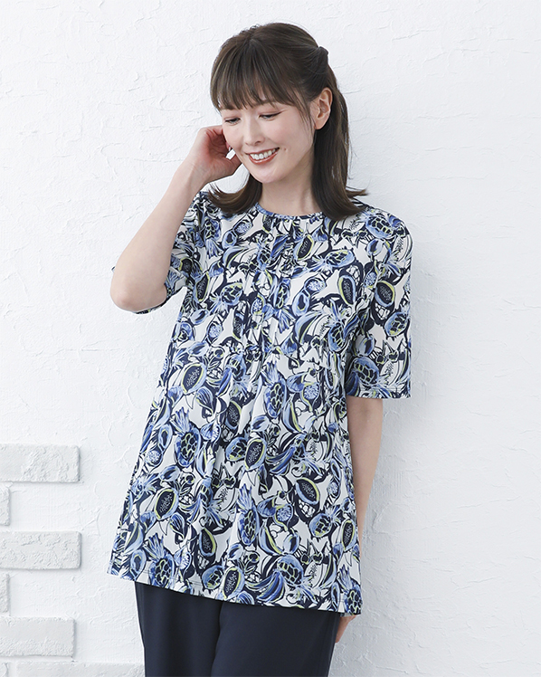 京都で染めた絵画タッチのフルーツ柄プリントに胸元のタックデザインがアクセントになっています。