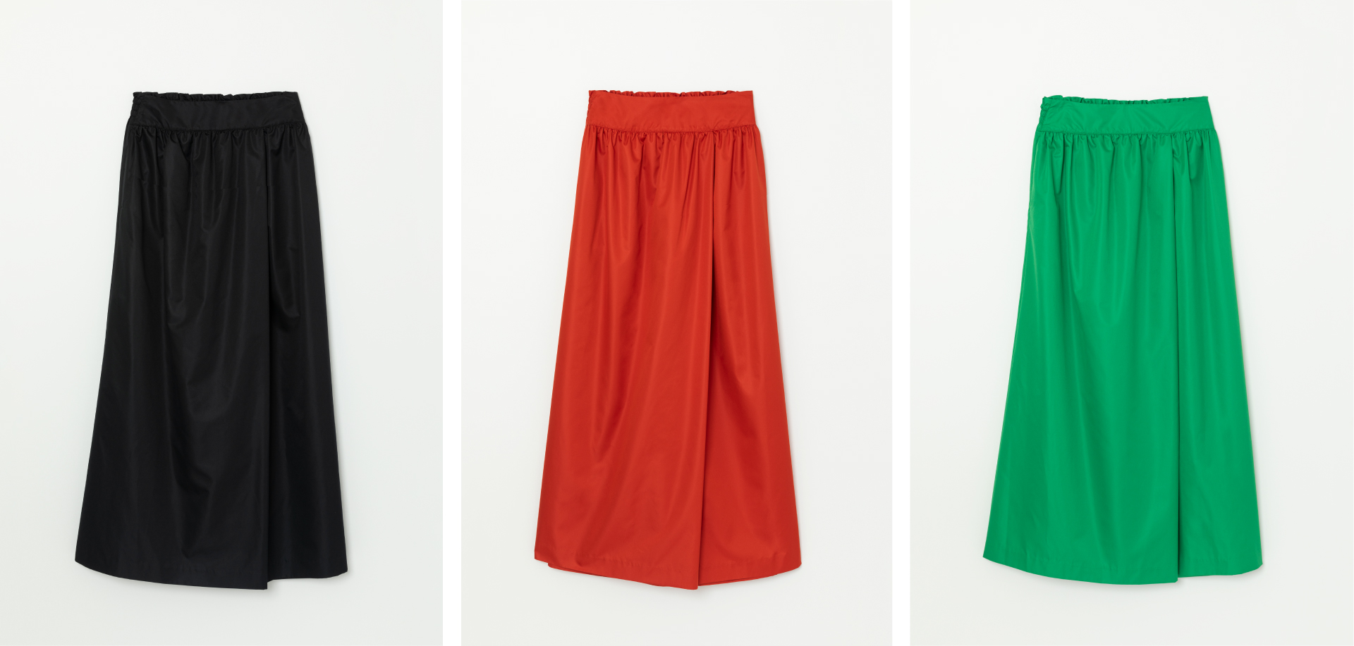 たっぷりとしたワイドシルエットの中に、真冬は厚手タイツやレギンスを仕込んでも、外に響か