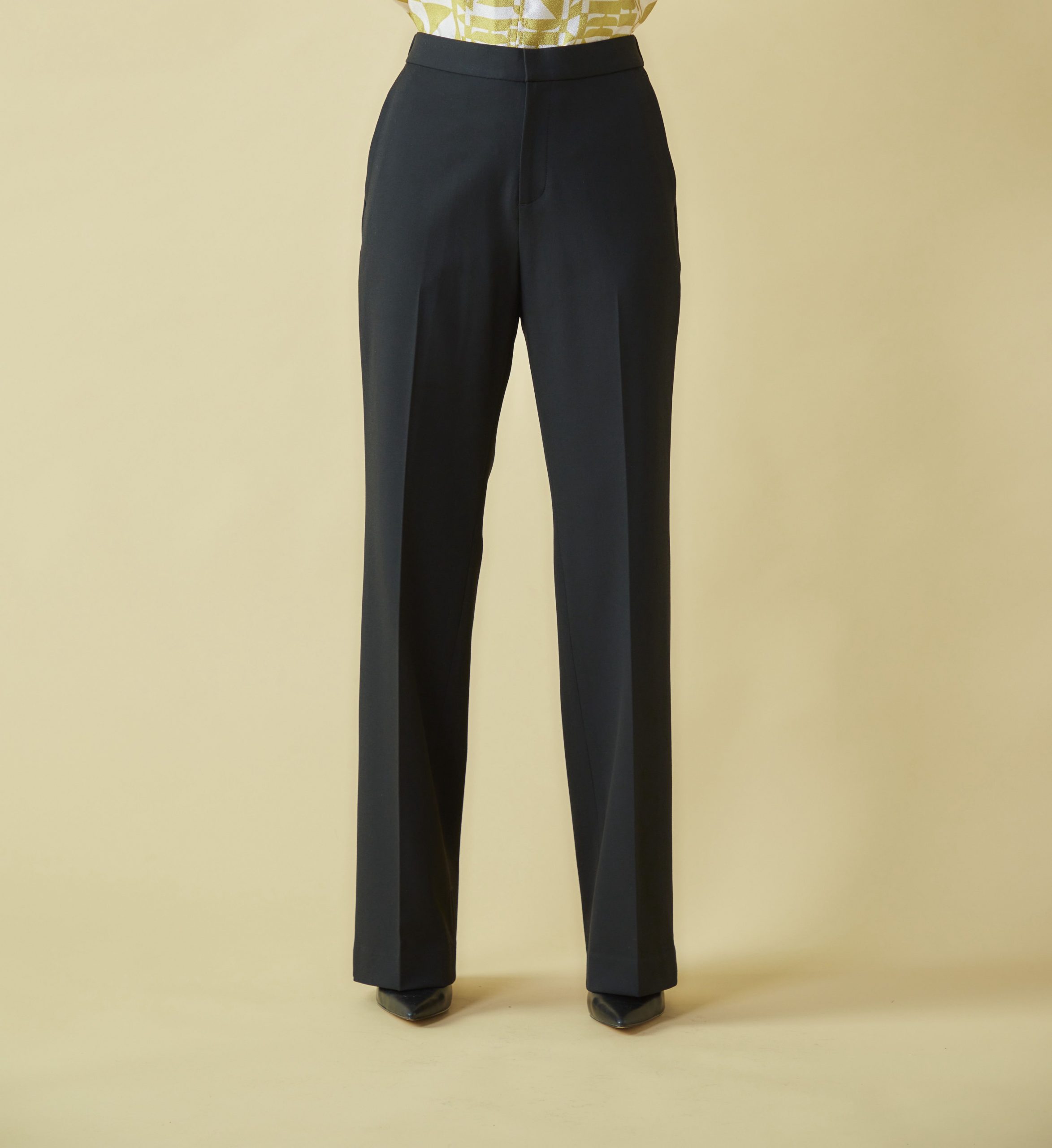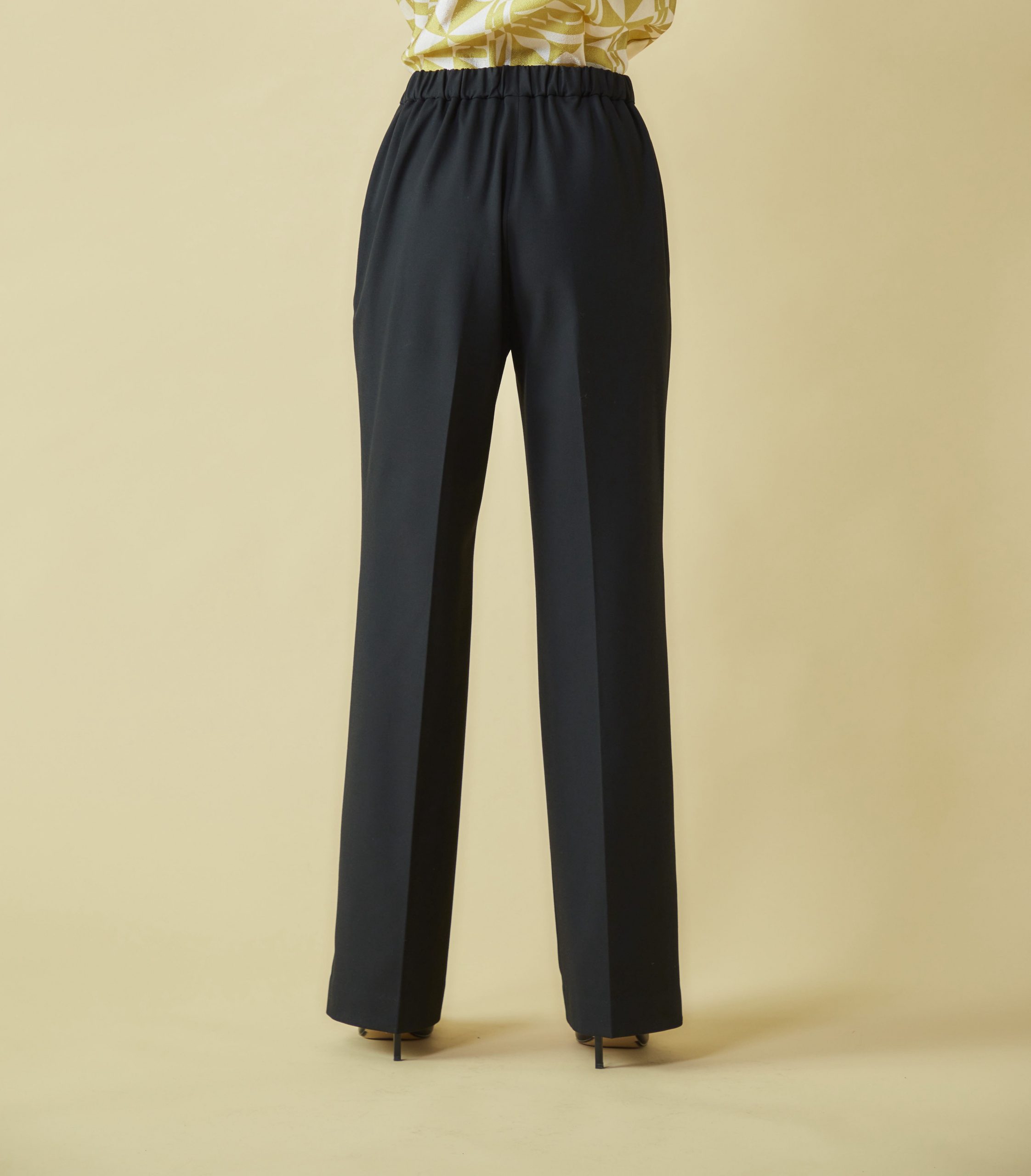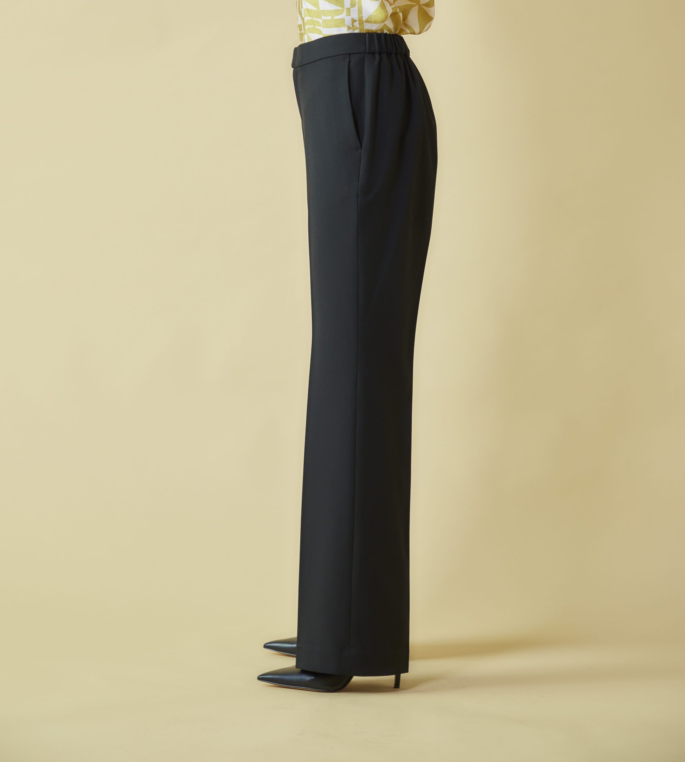 上品な光沢と動きやすいストレッチ性を合わせ持つNEWシルエットの美脚パンツは、トップスも合わせやすく、カジュアルにもエレガントにも着こなせます。
