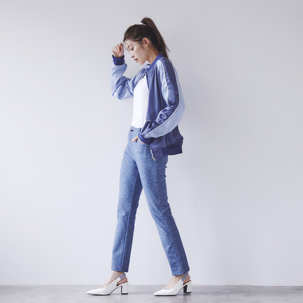 トップスを合わやすく、カジュアルなスタイリングがおすすめのスリムパンツです。