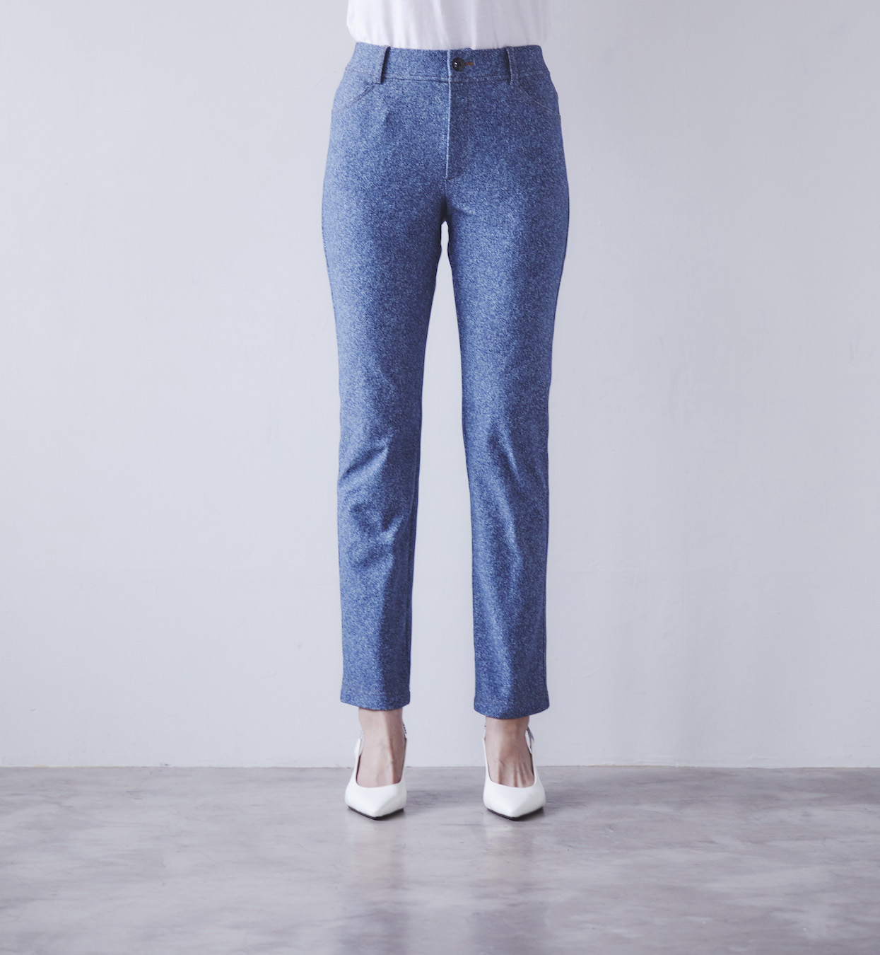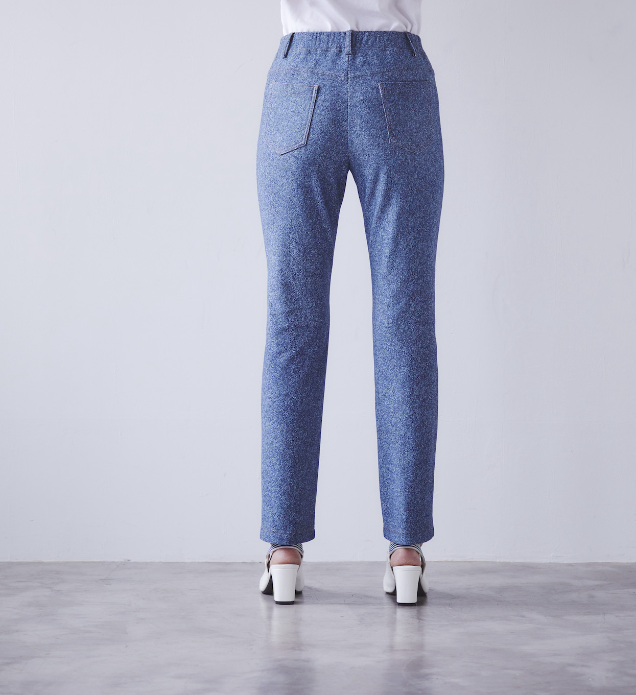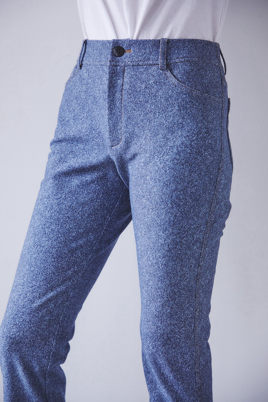 デニム調プリントを施した超ストレッチのハイテンションニット素材を使用しています。