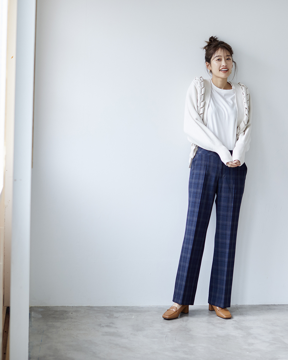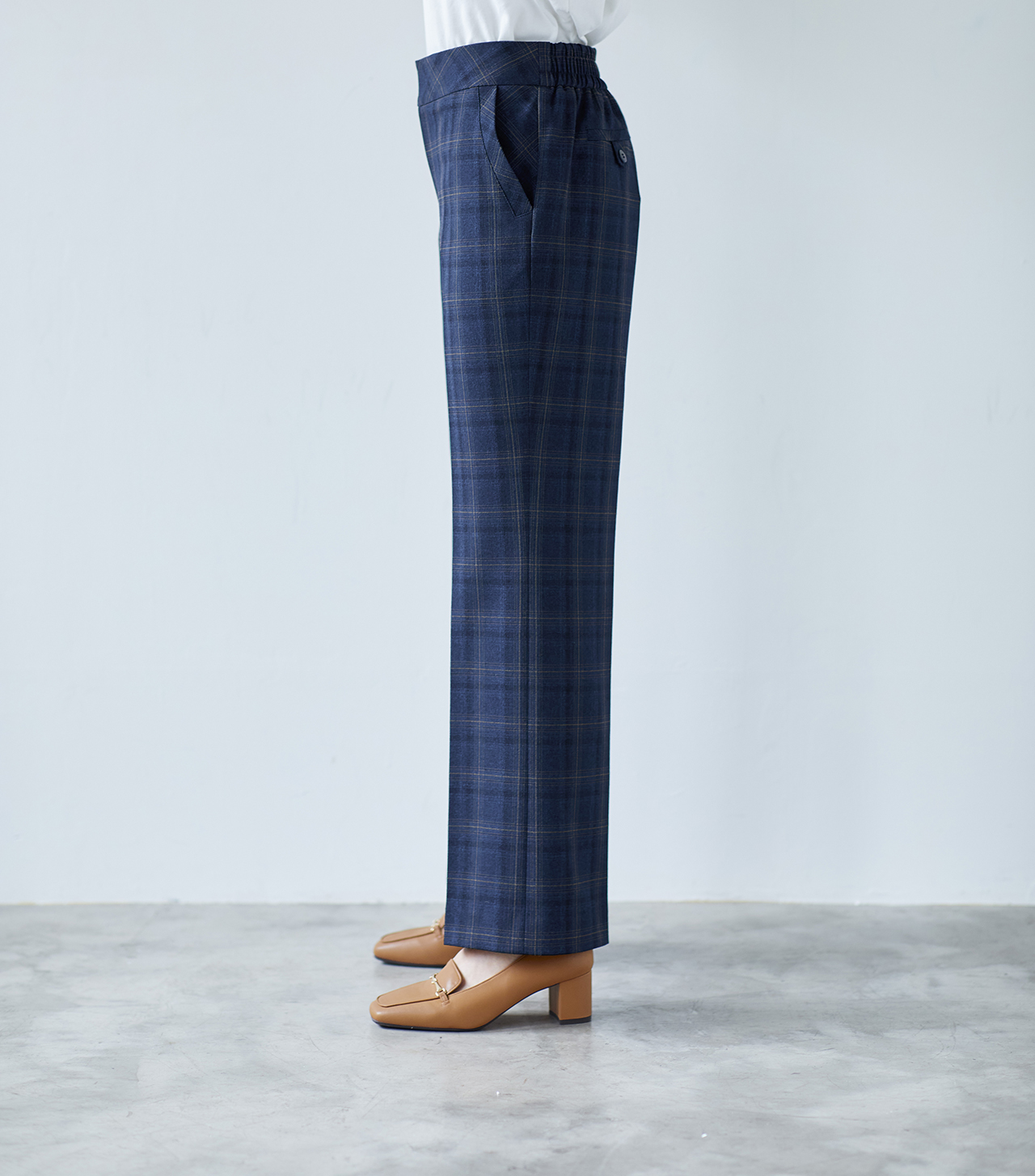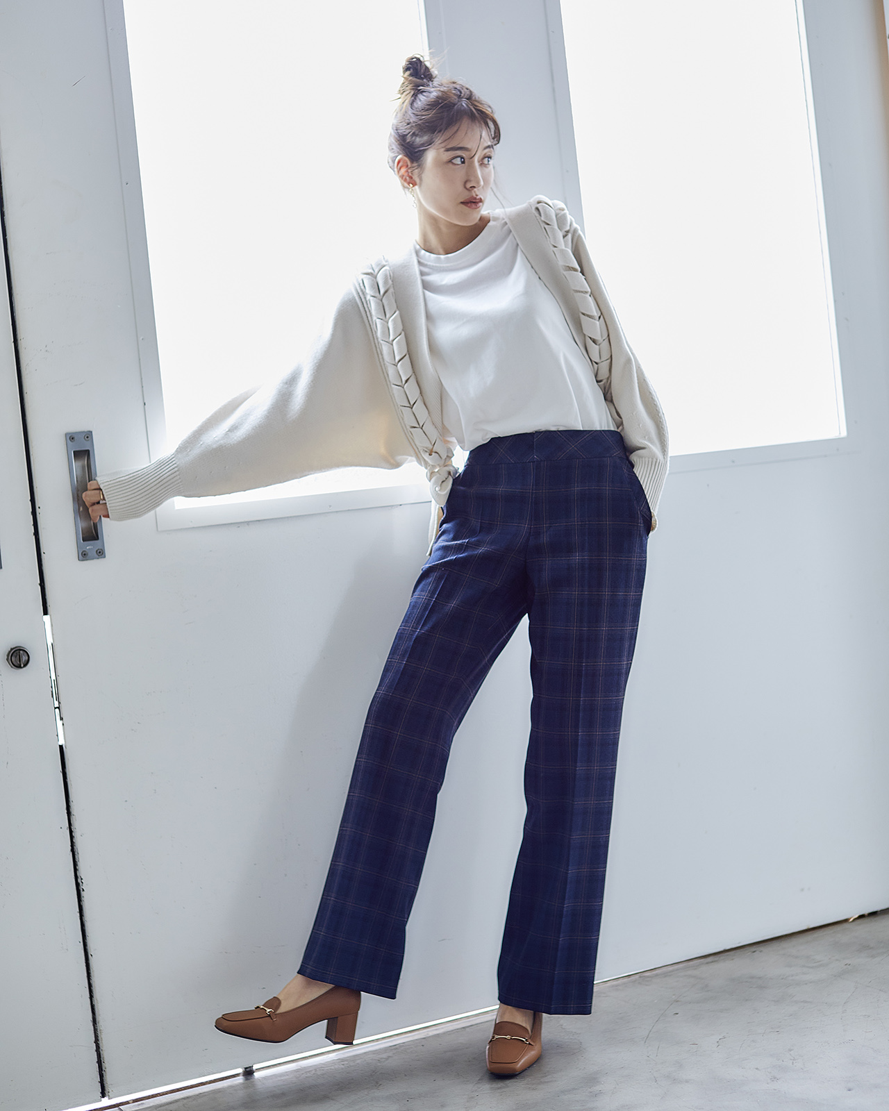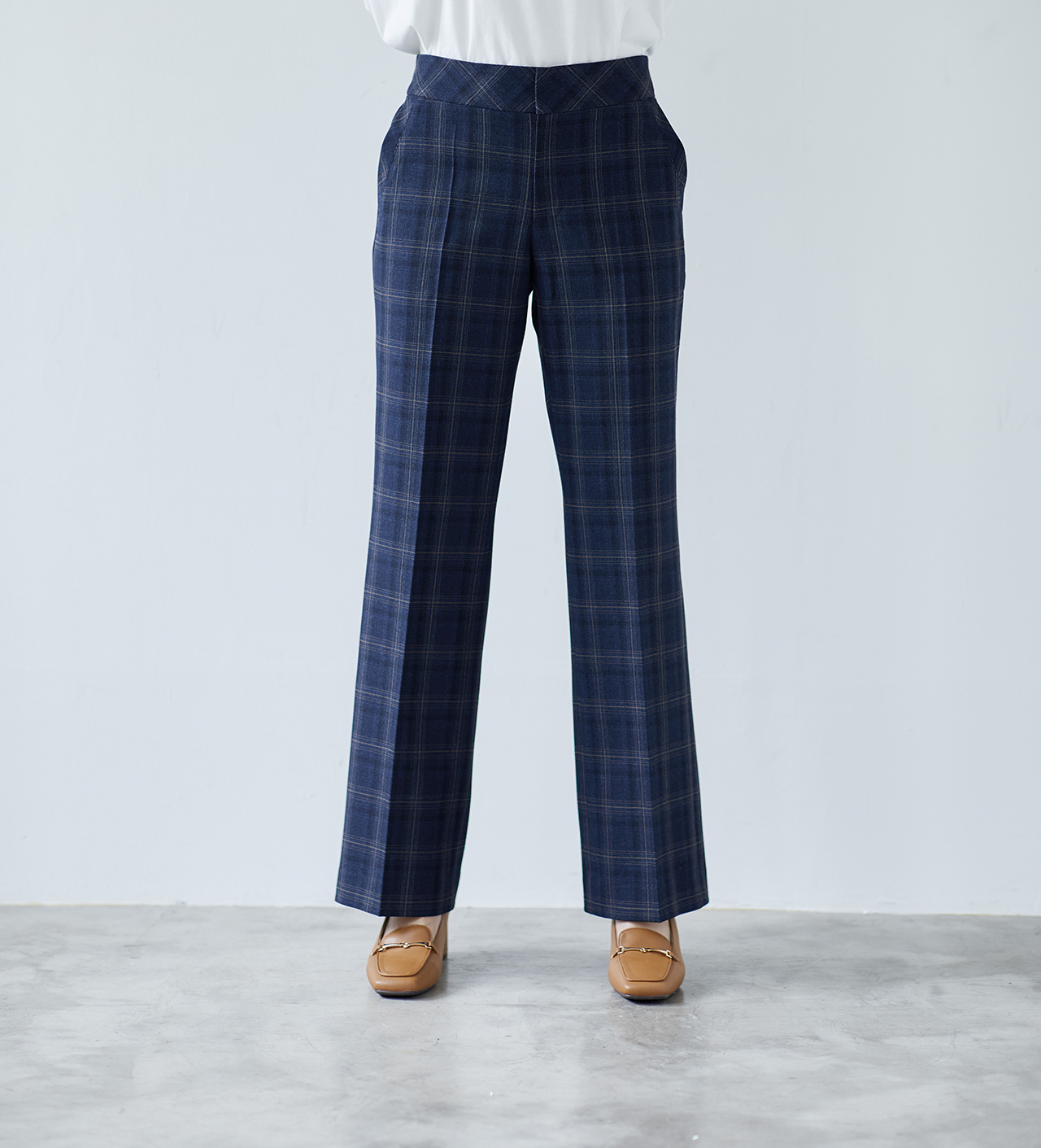 細く長く見せる2つの美脚効果のあるNEWシルエットのパンツは、トップスも合わせやすく、カジュアルにもエレガントにも着こなせます。