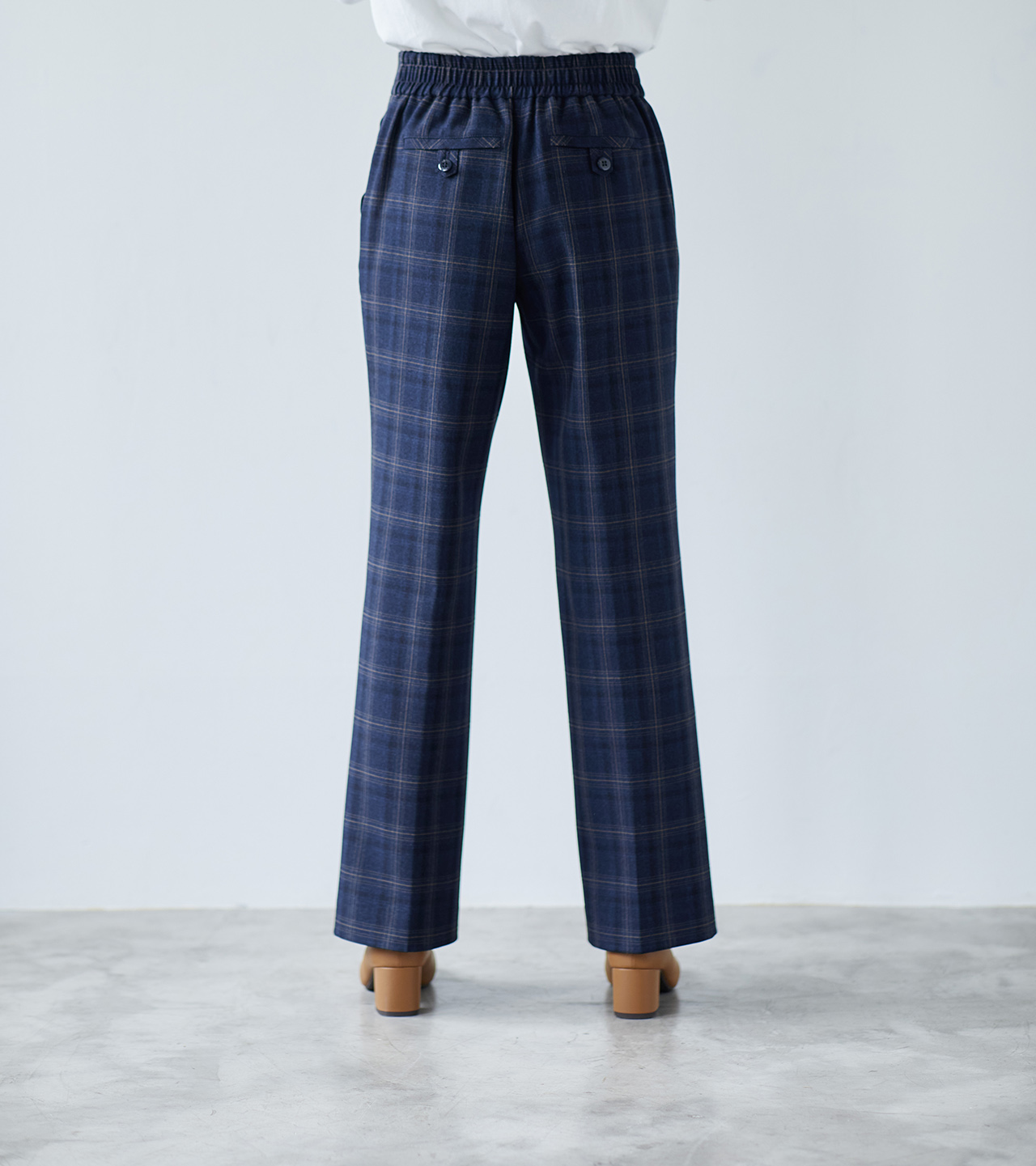 後面はギャザーゴムで窮屈感がなく、ハイウエスト(ベルト巾5cm)でモモまわりに程よいゆとりがあるセミワイドシルエットです。