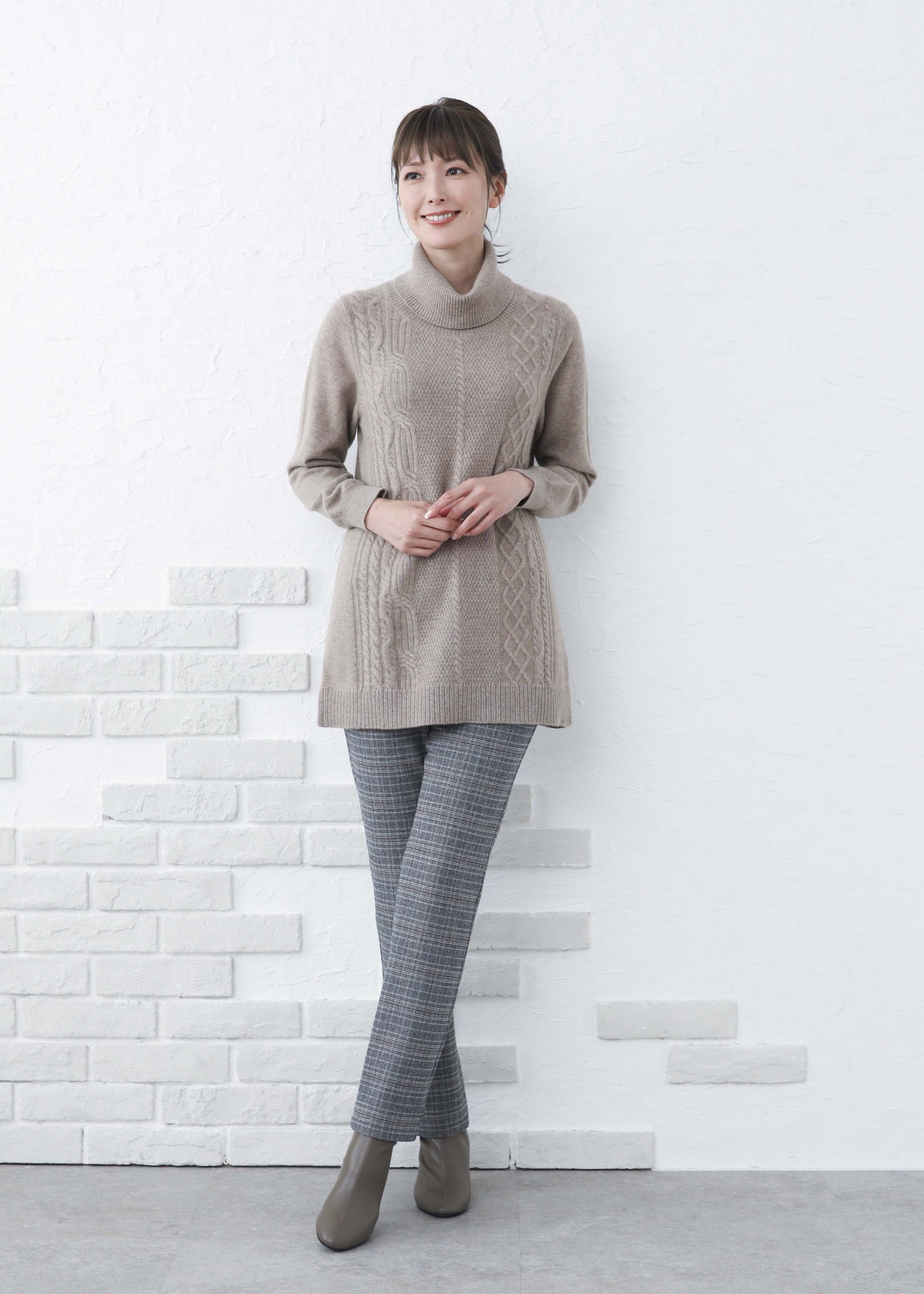 優しいオフタートルネックにアシンメトリーケーブルを編み込んだ、贅沢なチュニック丈プルオーバー。