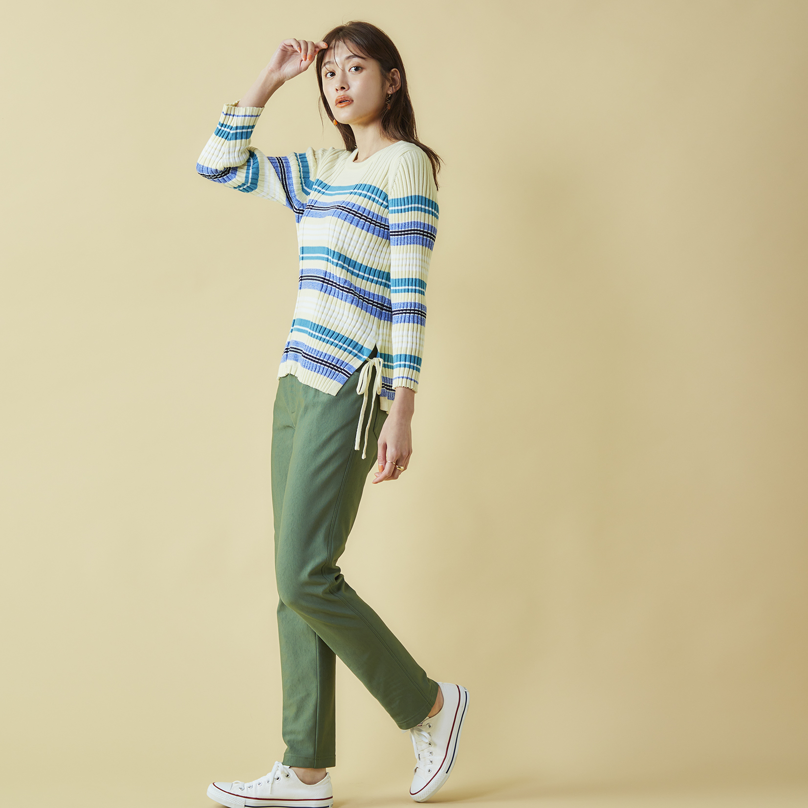 トップスを合わやすく、カジュアルなスタイリングがおすすめのスリムパンツです。