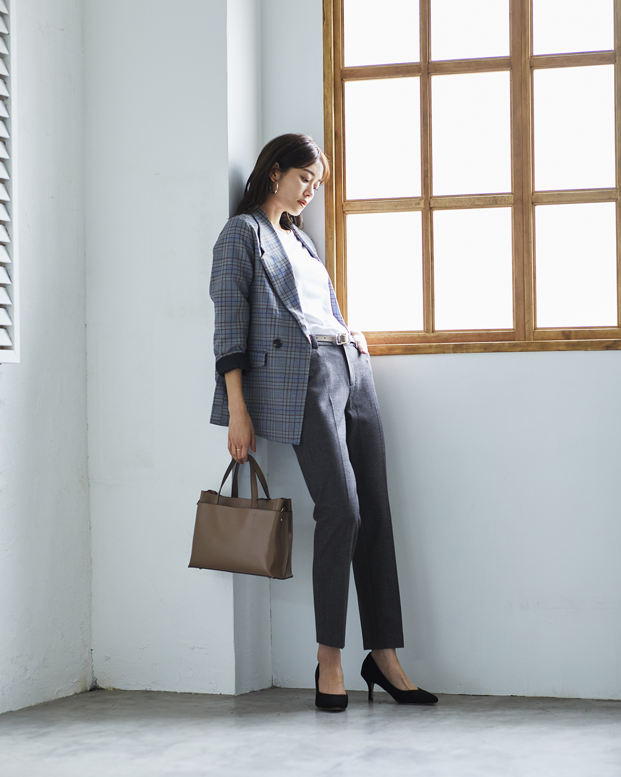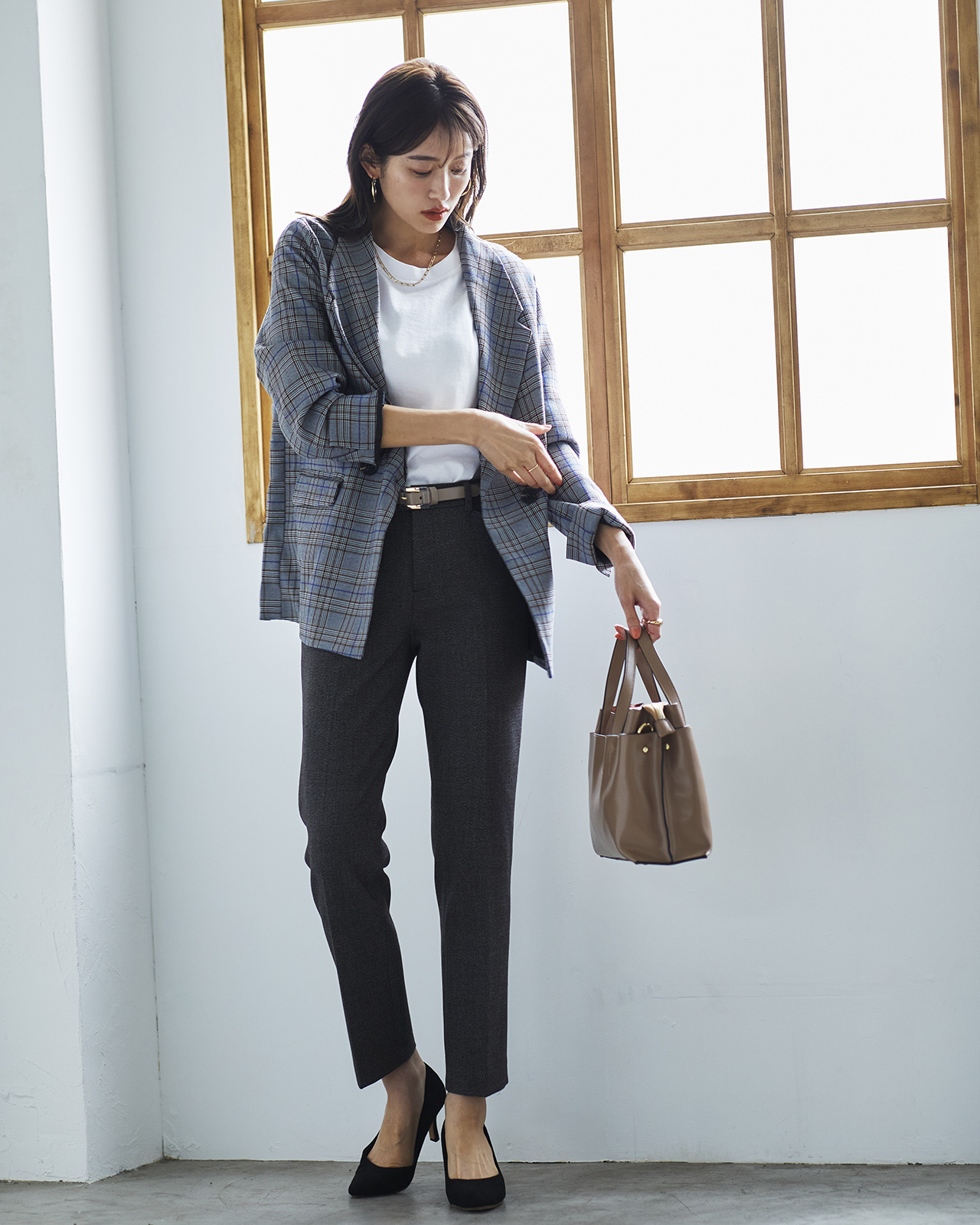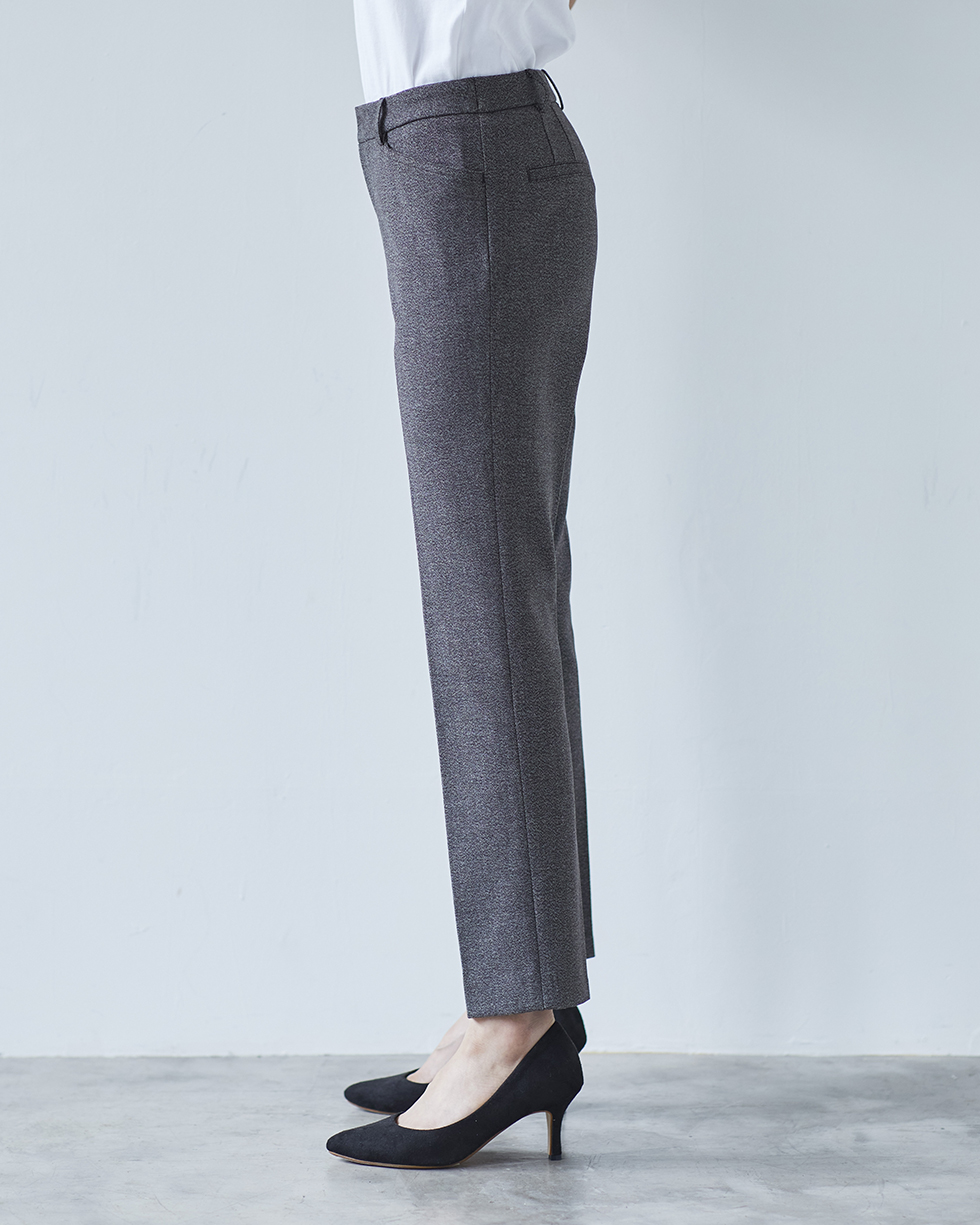 上品なミックスカラーが魅力のツイード調のストレートパンツは、シーンを選ばず活躍できる、着こなし自在なパンツです。