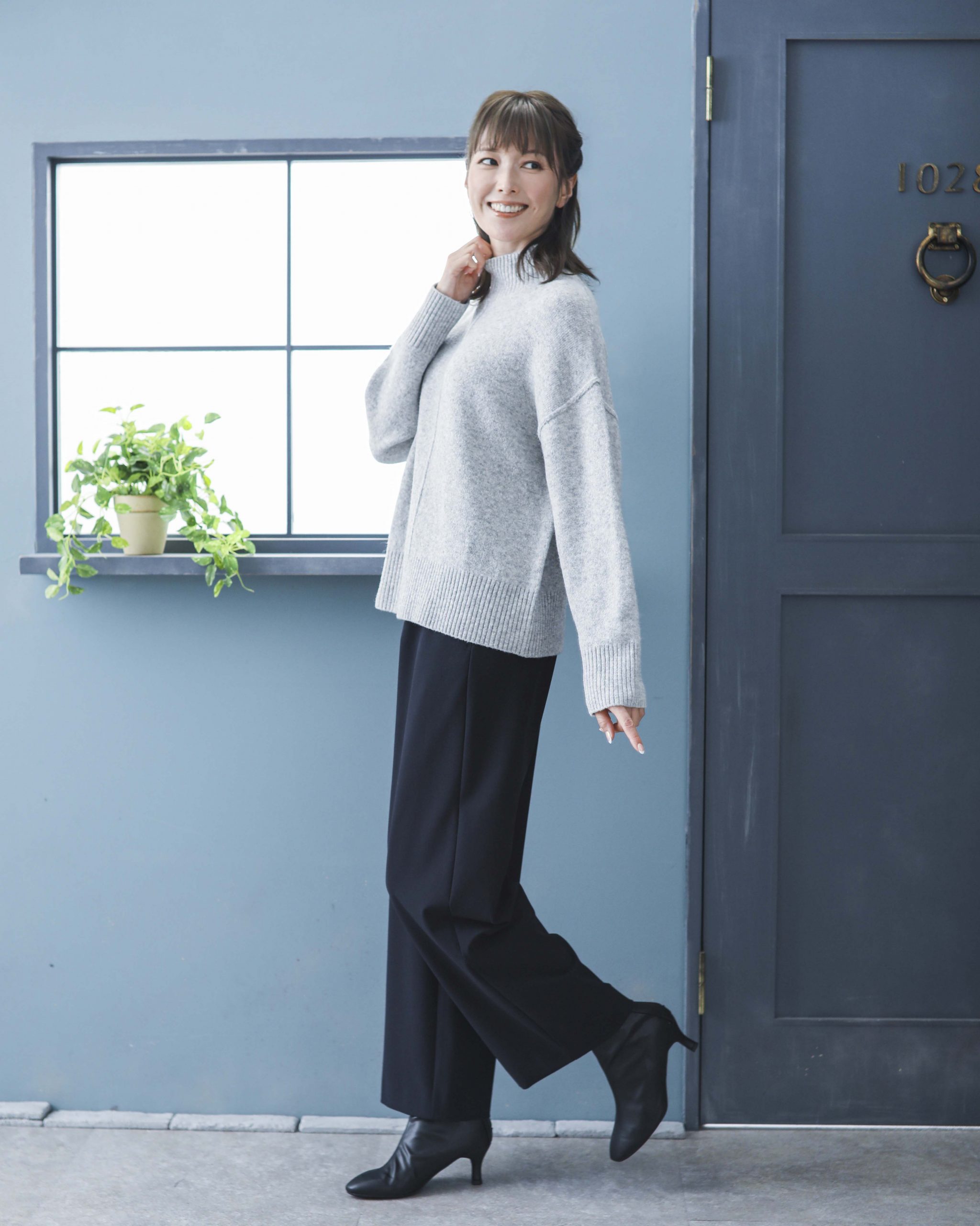 軽く暖かみのあるバルキー糸を使用したハイネックニットプルオーバー。 センターラインにタックを入れすっきりとしたデザインにしています。 ゆったりとしたデザインですが、袖・裾部分はすっきりしたバランスで、コーディネートしやすい一着です。