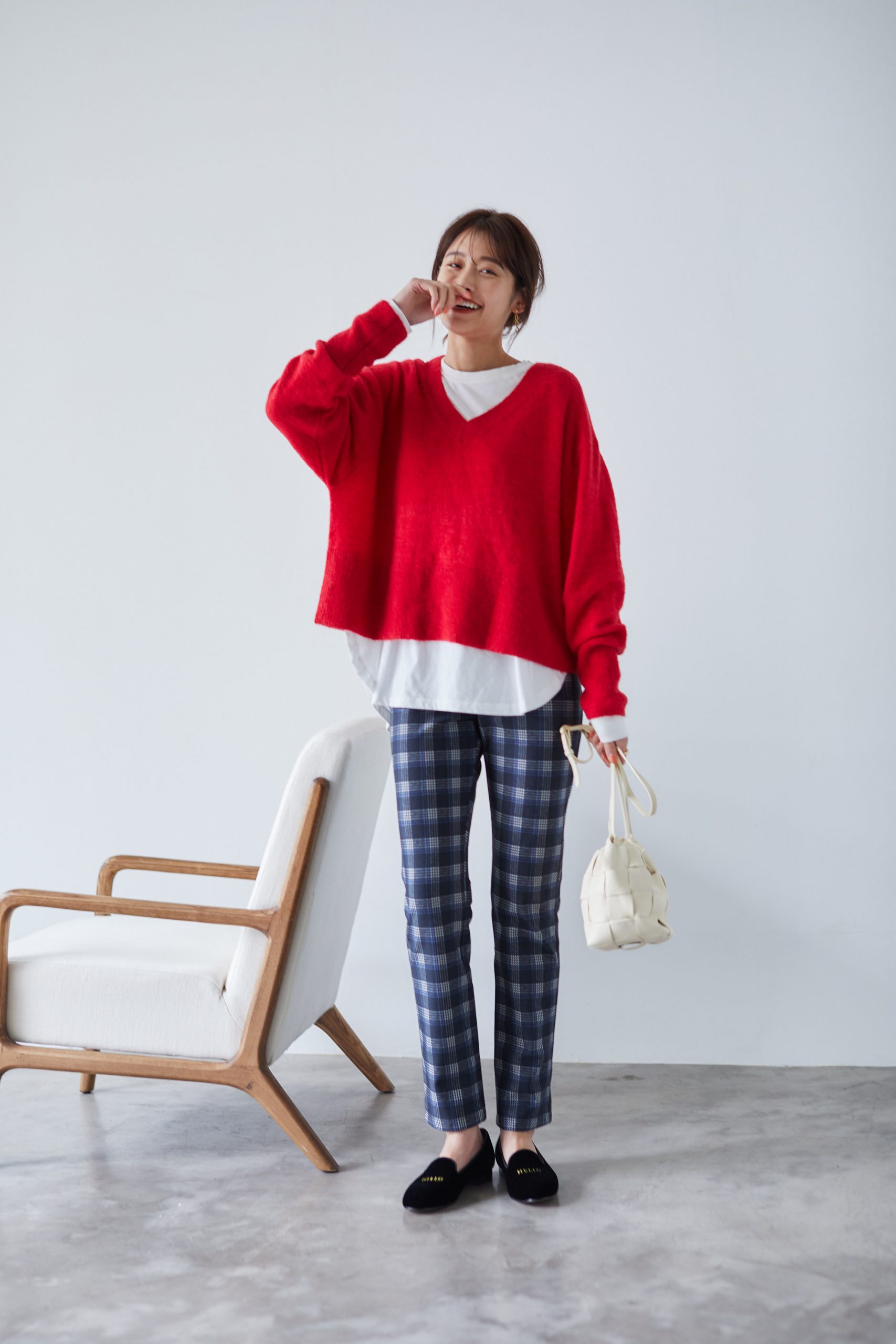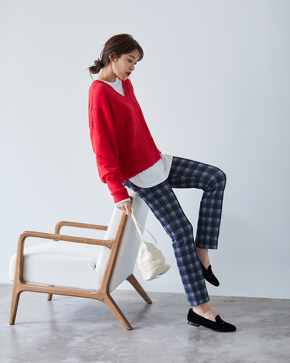トップスを合わやすく、カジュアルなスタイリングがおすすめのスリムパンツです。