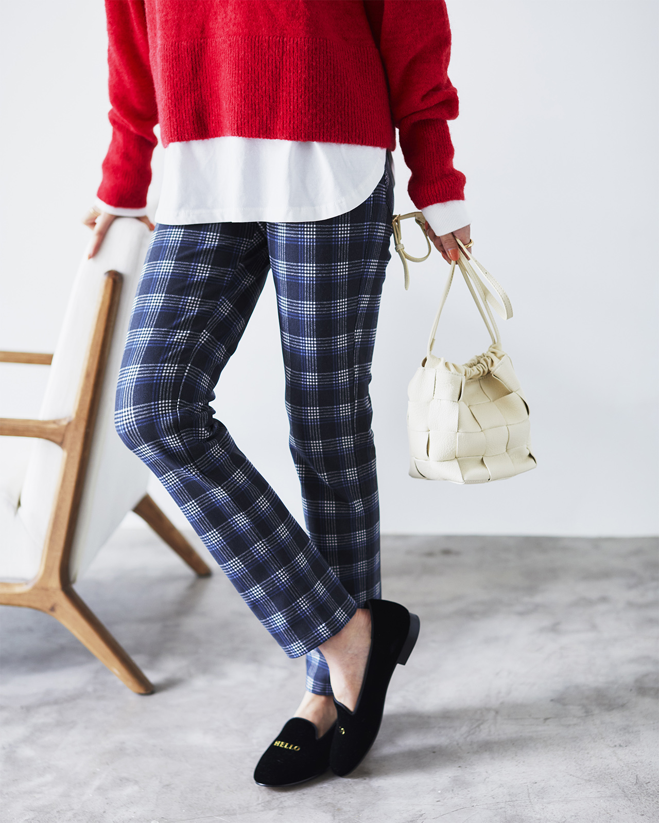 チェック柄プリントを施した超ストレッチのハイテンションニット素材を使用しています。裏面に深起毛加工を施し、柔らかく、肌触りが良く、保温性に優れているます、このため一日中はいていても疲れません。冬一押しのスリムパンツです。