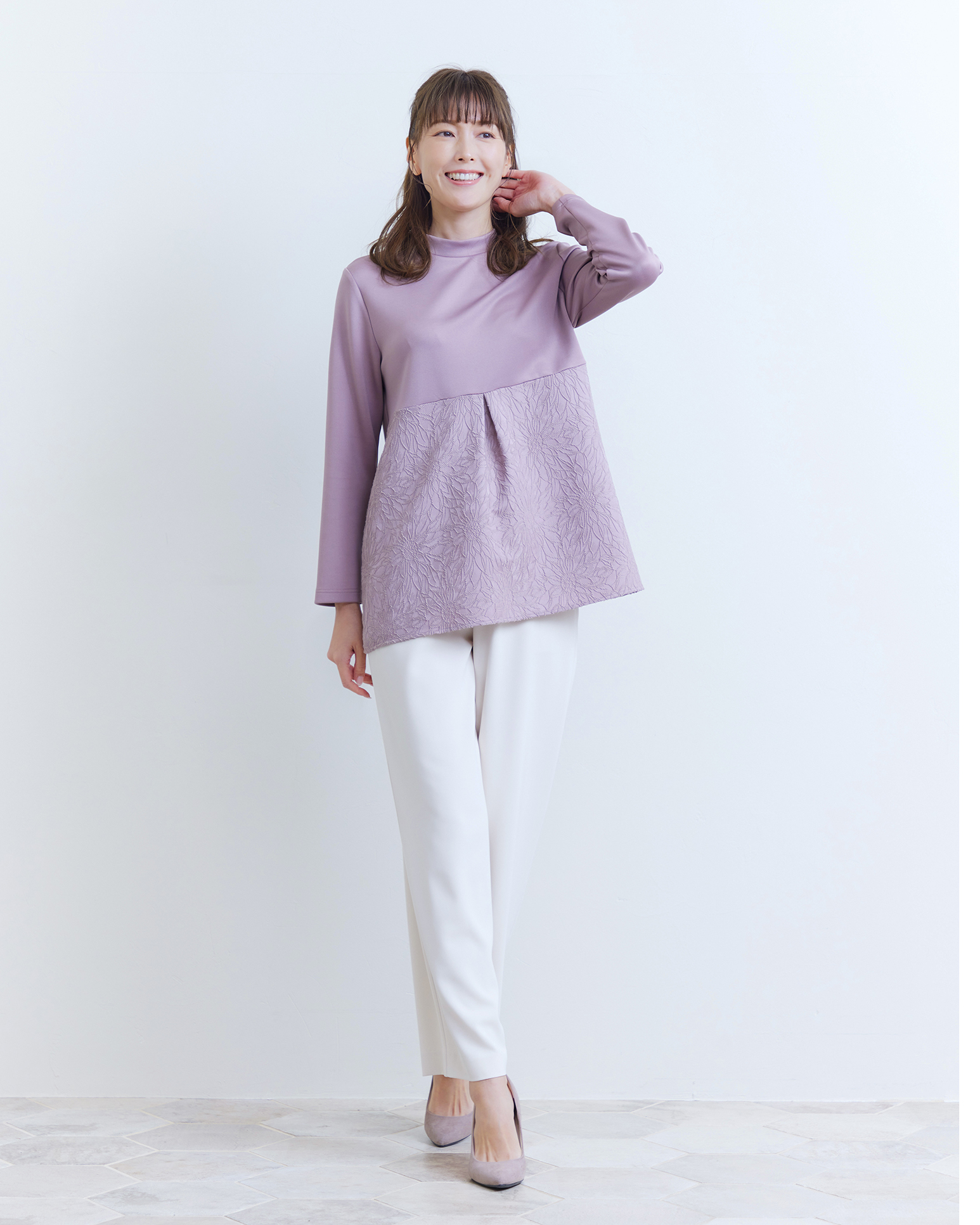 優しいふくらみ感のあるダンボールニットと立体的な花柄ジャカードを切り換え、華やかなルックスに仕上げたカットソー。