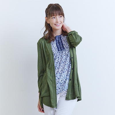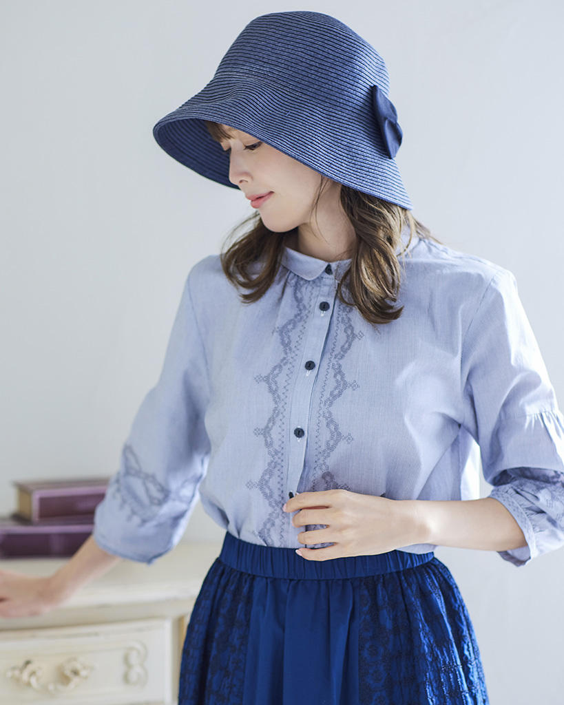 前身頃と袖口のクロスステッチ刺繍をアクセントにした、上品なルックスのラウンドカラーストライプブラウス。 襟元と袖口のギャザー、ボリュームのあるパフスリーブデザインでフェミニンな印象に。