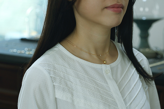 ベビーパールネックレス[K18/淡水パール]41,800円、せかいにひとつだけのかたちチャームネックレス[K18]77,000円(ともにTodos)