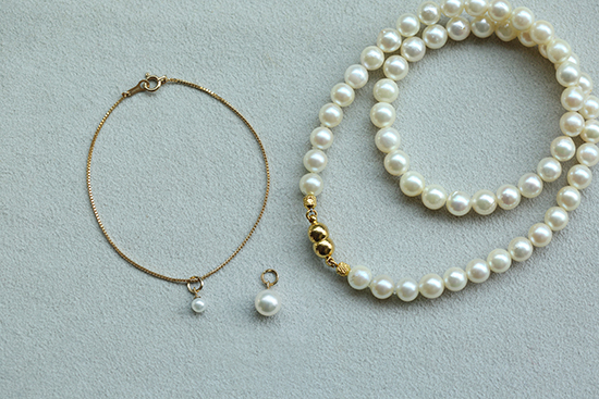 (右)長さのあるパールのネックレスを短くし、着脱しやすいようにマグネット式の留め具に。