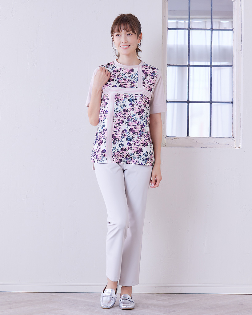 スカーフモチーフプリントの布帛生地を前身頃に切り替えたカットソー。 水彩画タッチのグラデーションフラワープリントが涼し気で上品な印象に。 ■Shop List