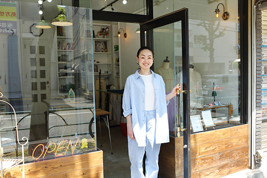 リカキカクがあるのは、世田谷線・上町駅から徒歩9分ほどの世田谷通り沿いにある古いビルの1階。 テーラーのようなスタイリッシュな店構えのお店です。 「いつかは自分のお店を持ちたいと思っていましたが、一人で始めるのは不安でした。 そんなとき、知人を通じてこの場所に出合い、間借りさせていただくことになりました」。 ここは以前、服を作る人たちが出入りするアトリエ兼ポップアップショップだったそう。 2022年、それぞれが新たな場所に活動の拠点を移したのをきっかけに、一人で活動を始めたといいます。