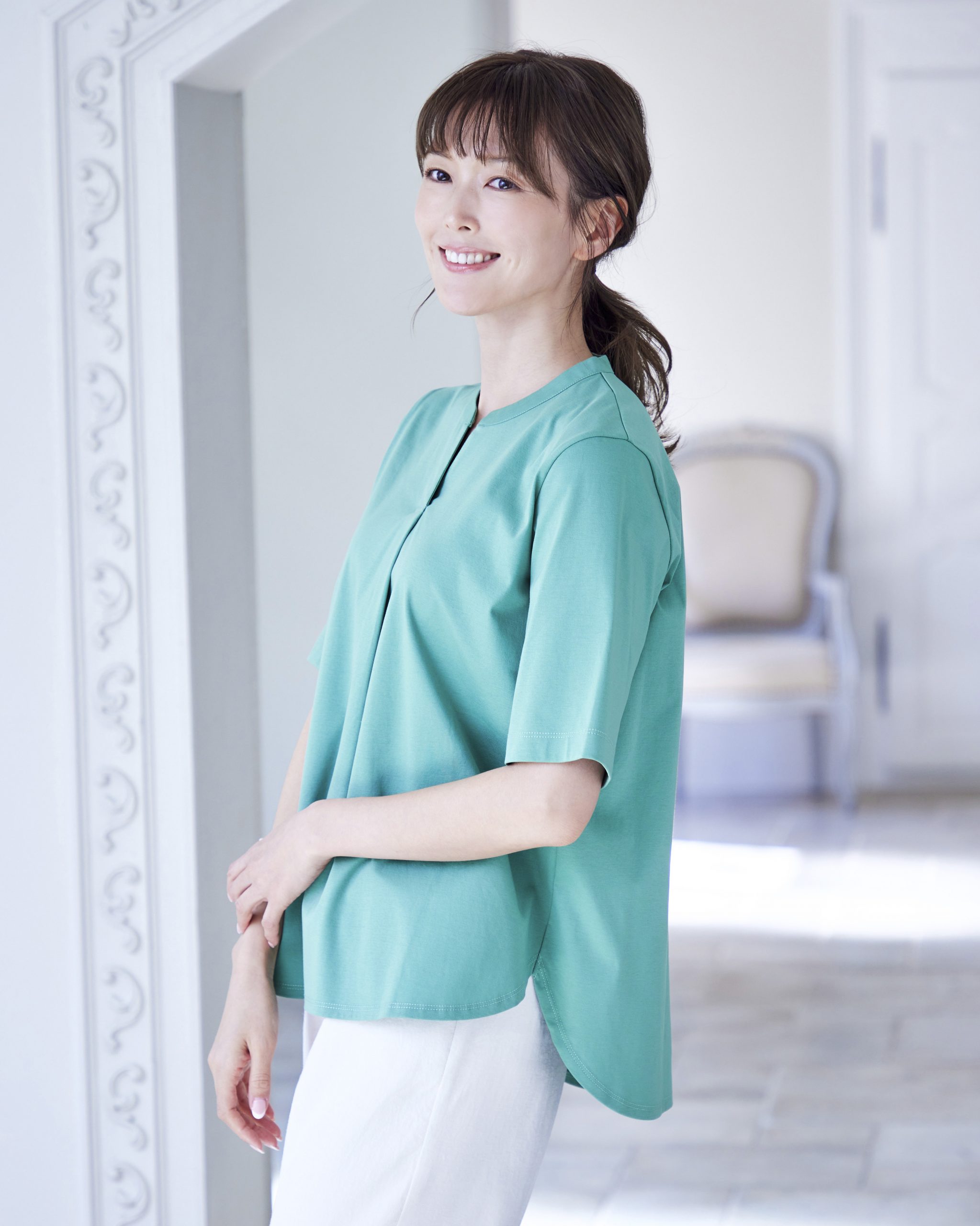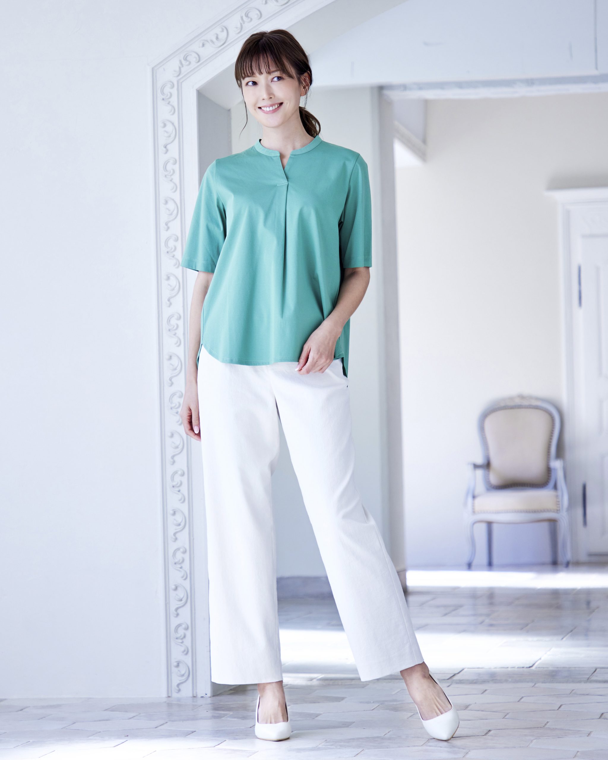 スキッパーと胸元にタックを入れることで、シンプルながら上品なキレイめルックスに。