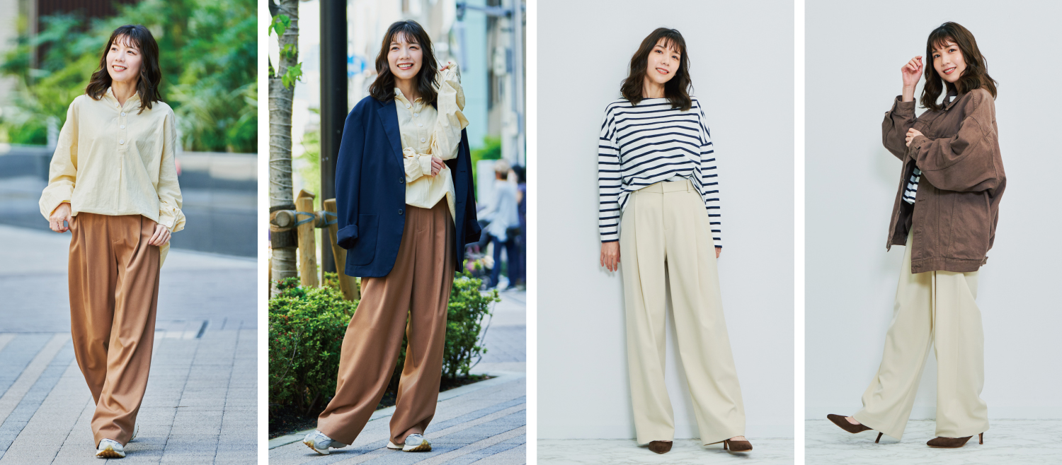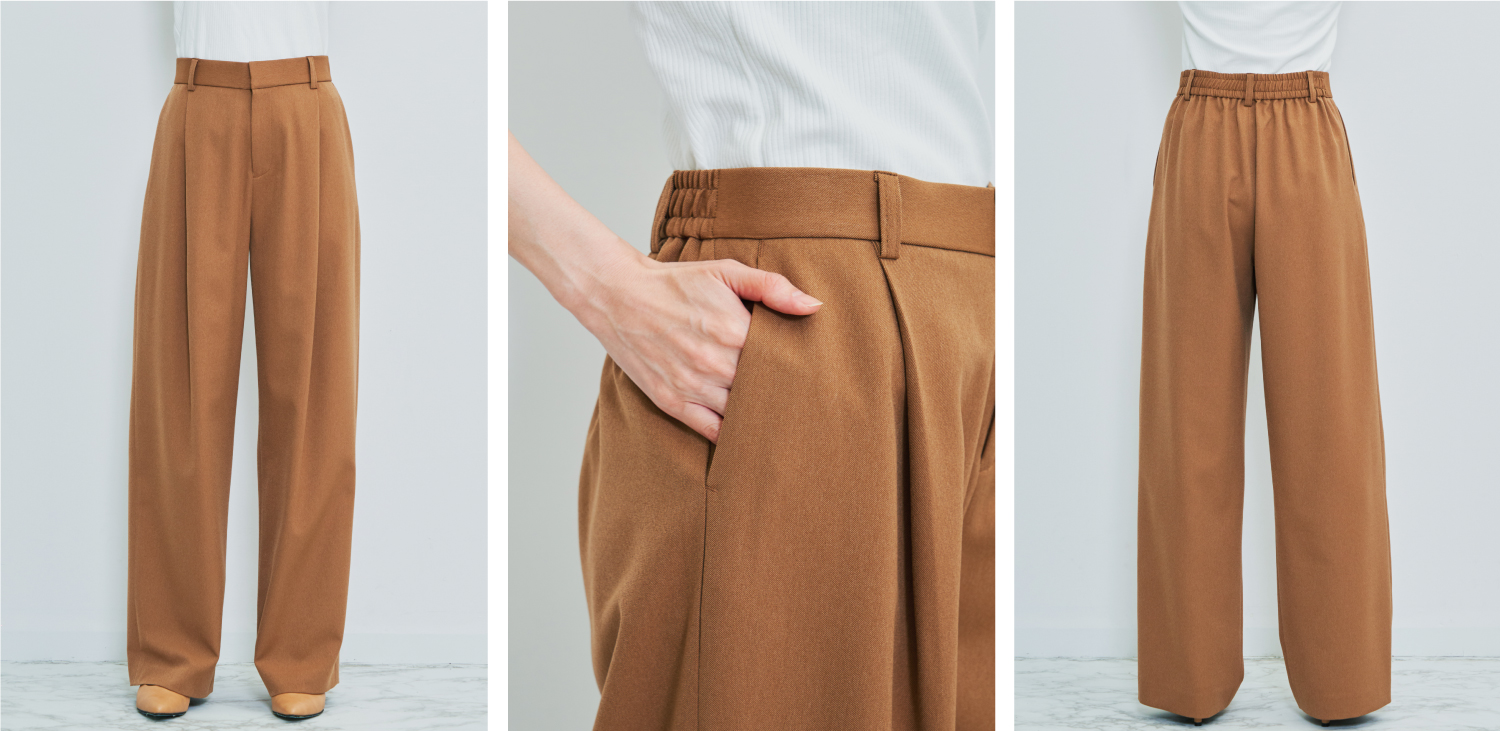 ワイドシルエットにして、タックを深めに入れることでカジュアル要素をプラス。 ウエストは後ろをゴムギャザーにしてはきごこちがよく、ゆったりとしたワイドシルエットなので 冬の寒い日は中にタイツを忍ばせて着用することも可能です。 素材はポリエステル糸を使用したシワになりにくいストレッチ素材を使用。 さらりとして肌触りが良く快適に着用いただけます。 カラーは、一枚持っているととても着回しがきくベージュと、 コーディーネートに入れるだけで一気にまとまるブラウンの2色展開。 どちらのカラーもワントーンコーデやカジュアルな着こなしなど、 合わせるアイテム次第で様々な印象を楽しんでいただくことができるロングシーズン着用できる便利なボトムスです。 STORY のパンツは、すべてご家庭で洗濯できるので、オフィスカジュアルスタイルにも取り入れやすいです。