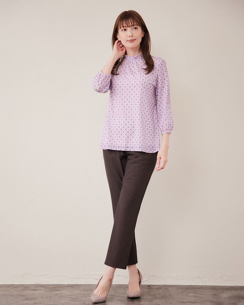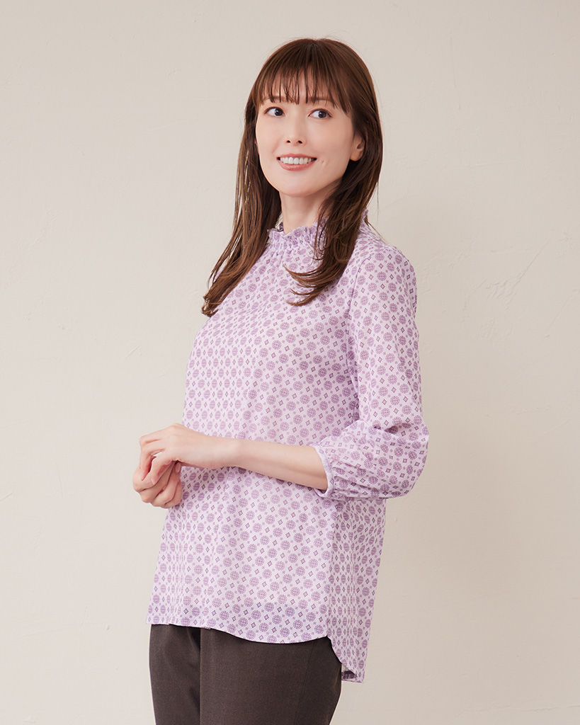 さらっとした肌触りと高い伸縮性で着心地抜群のメッシュ素材を使用した日本製パワーネットカットソー。 上品な小紋柄に、襟のシャーリング、袖口のギャザーで柔らかなフェミニンルックに仕上げています。