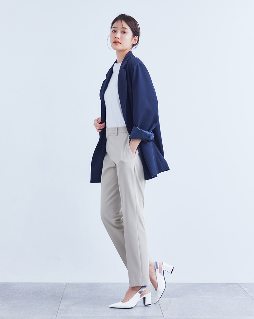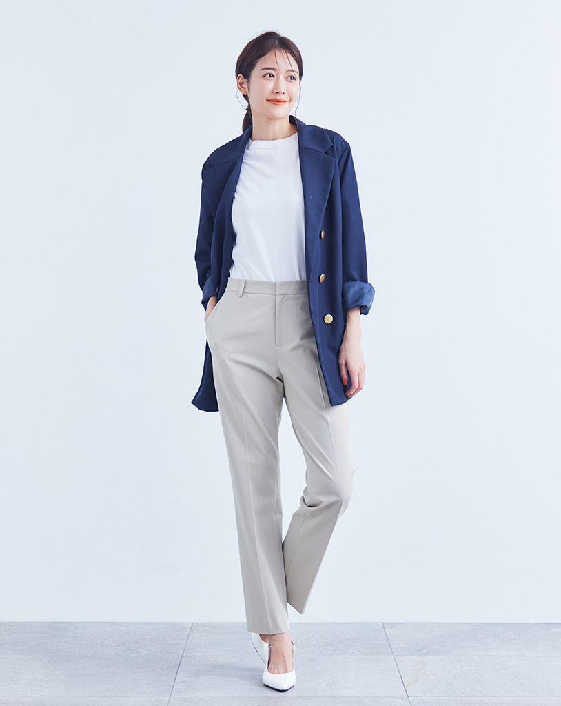 シンプルなキレイめアンクルパンツは、トップスを合わせやすく、カジュアルにもエレガントにも着こなせます。