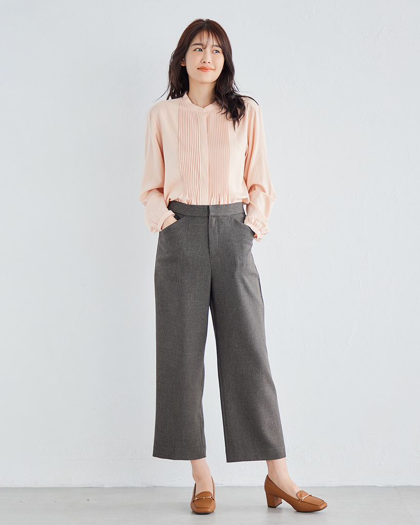シンプルなキレイめアンクルパンツは、トップスを合わせやすく、着回し自在です。